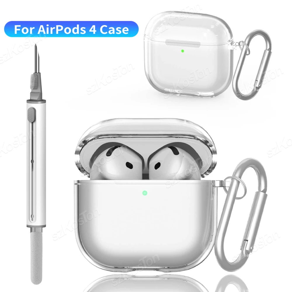 Comprar Funda transparente para auriculares AirPods 4, funda protectora transparente de TPU suave con Kit de limpieza, llavero para accesorios AirPods4