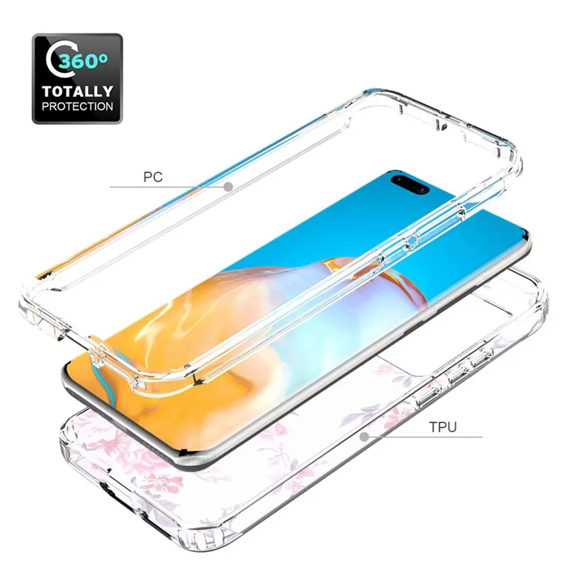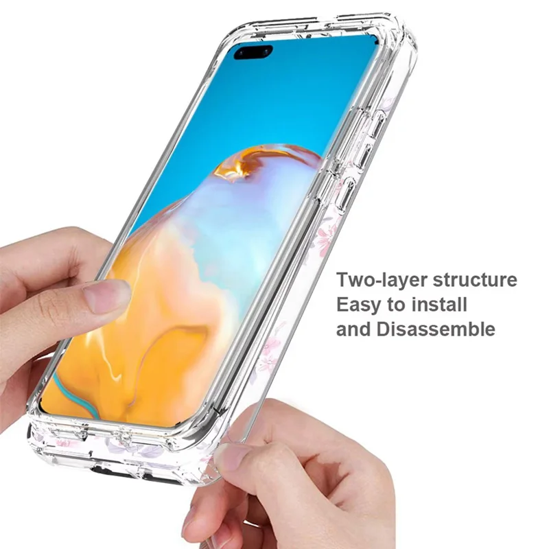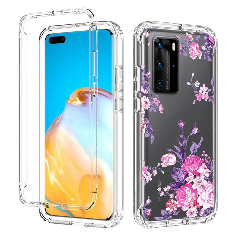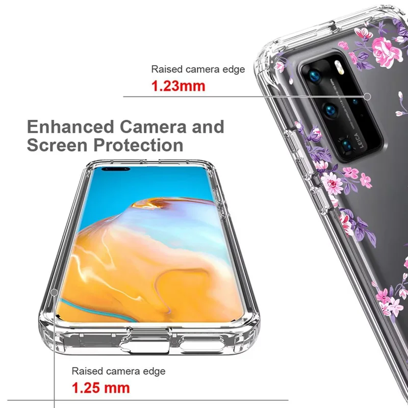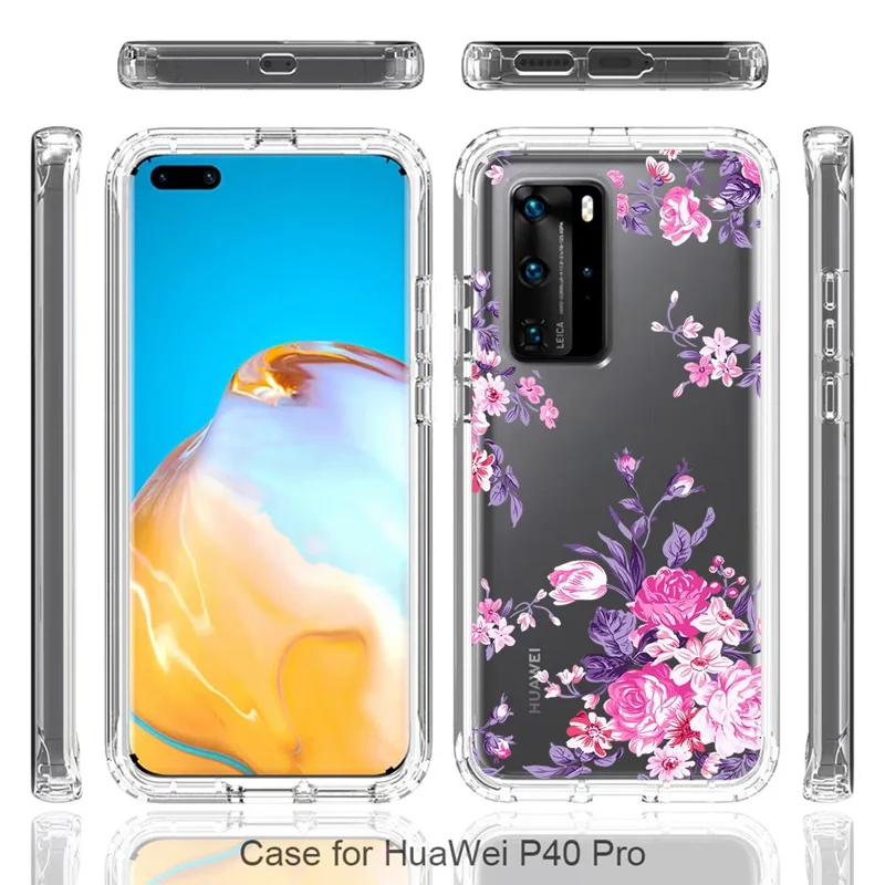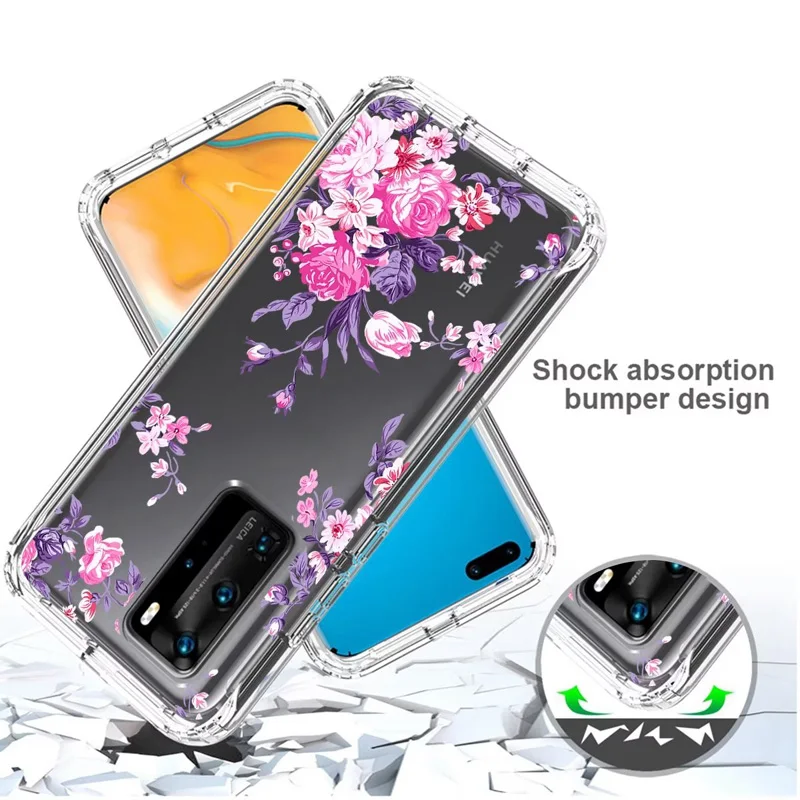 Funda de flores transparente para Huawei P40 Pro, parachoques de PC duro transparente de ELS-N04 + funda trasera de teléfono elegante a prueba de golpes de TPU suave