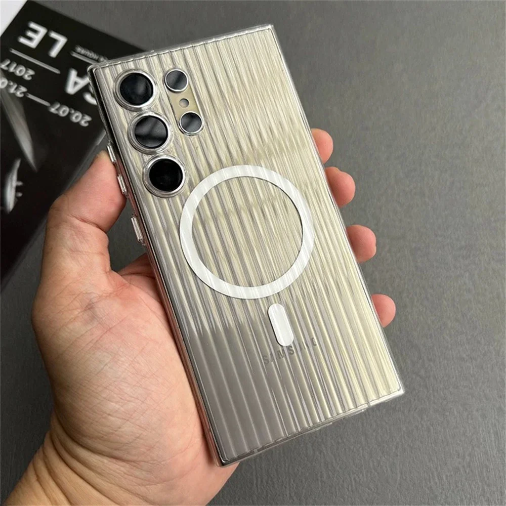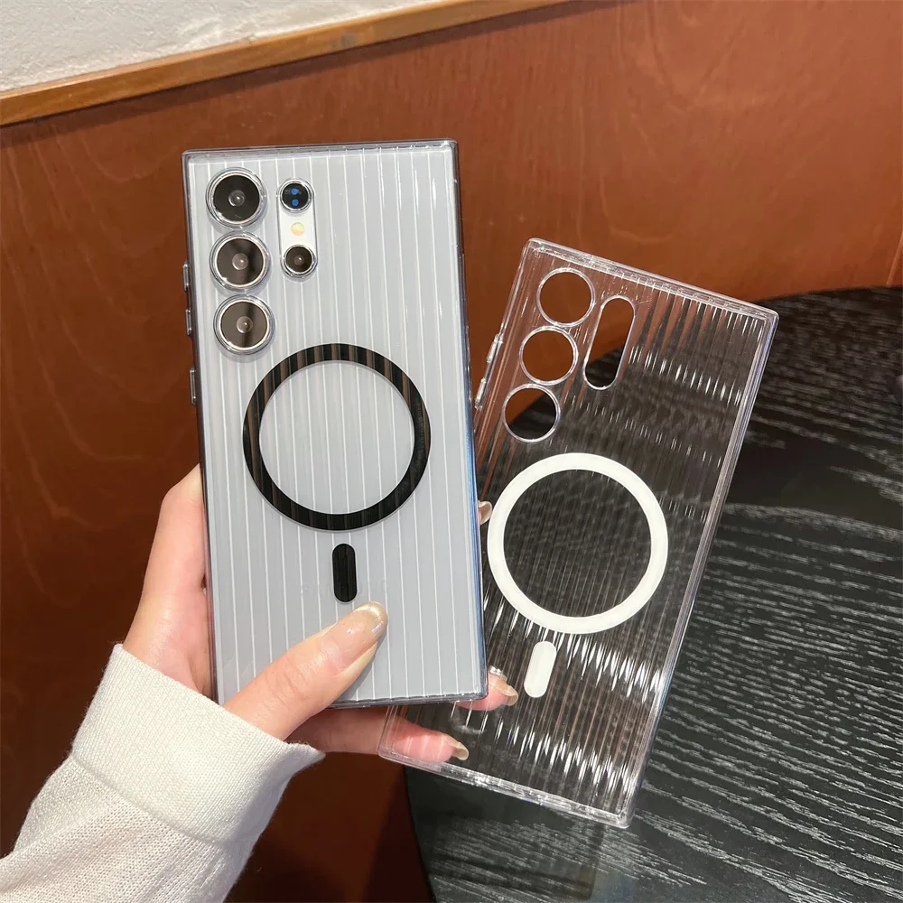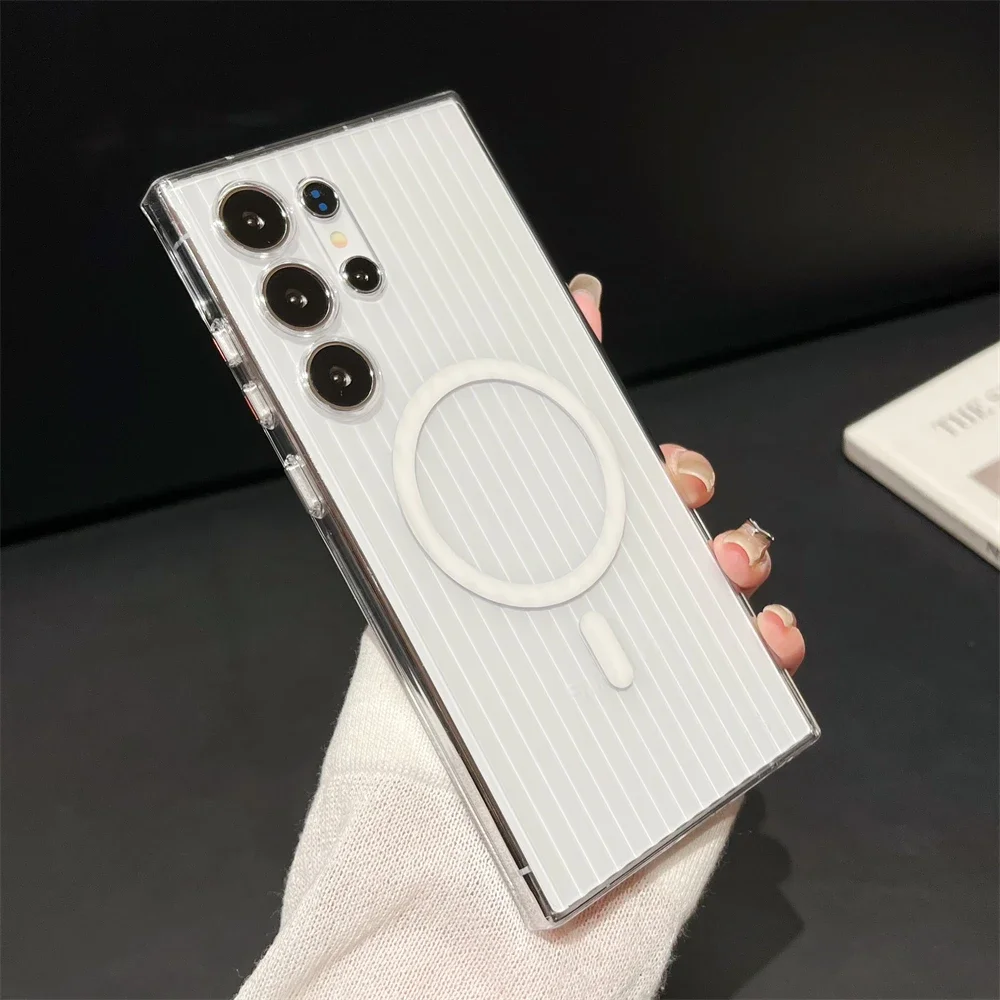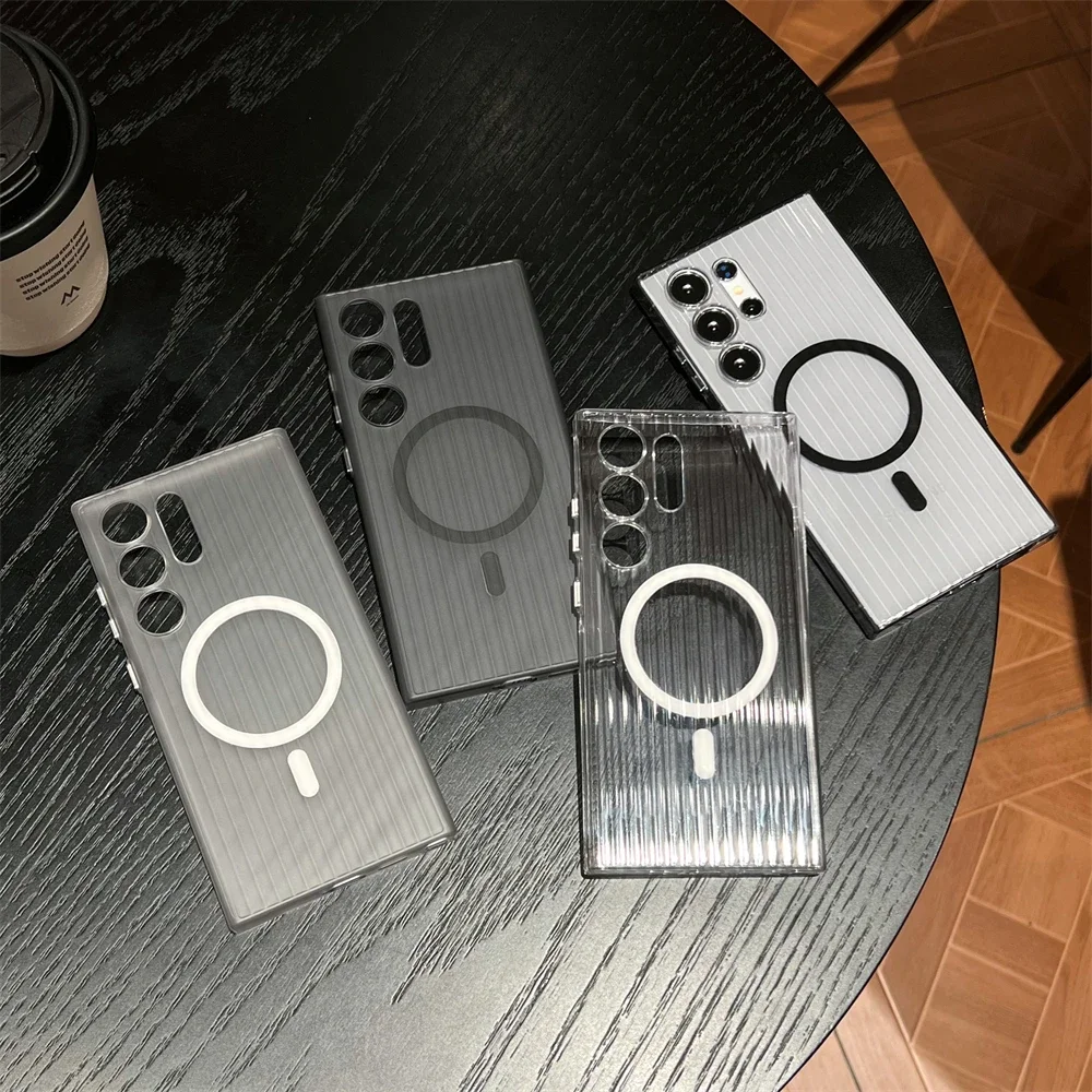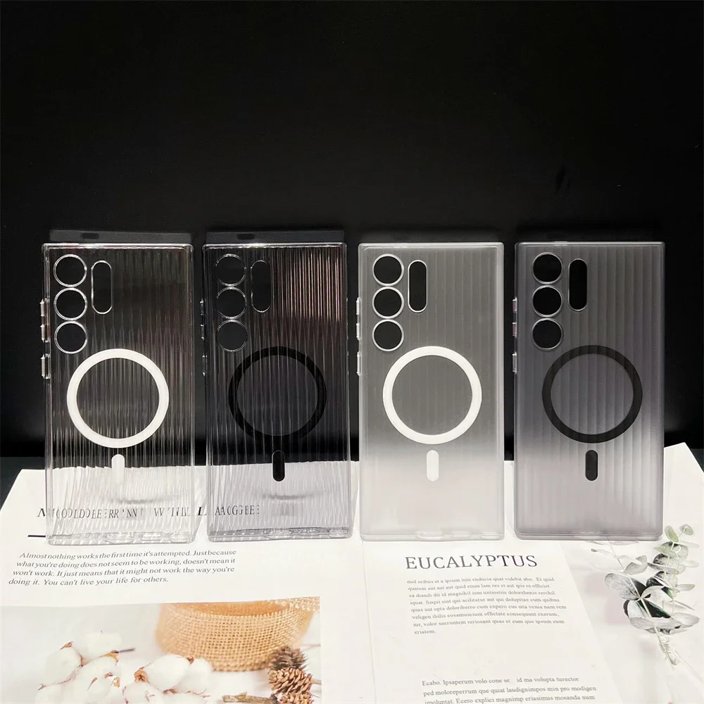 Luxury Hard HD Transparent for Magsafe Case for Samsung Galaxy S24 S23 Ultra Plus Magnetic Wireless Charging Stripes PC Cover
