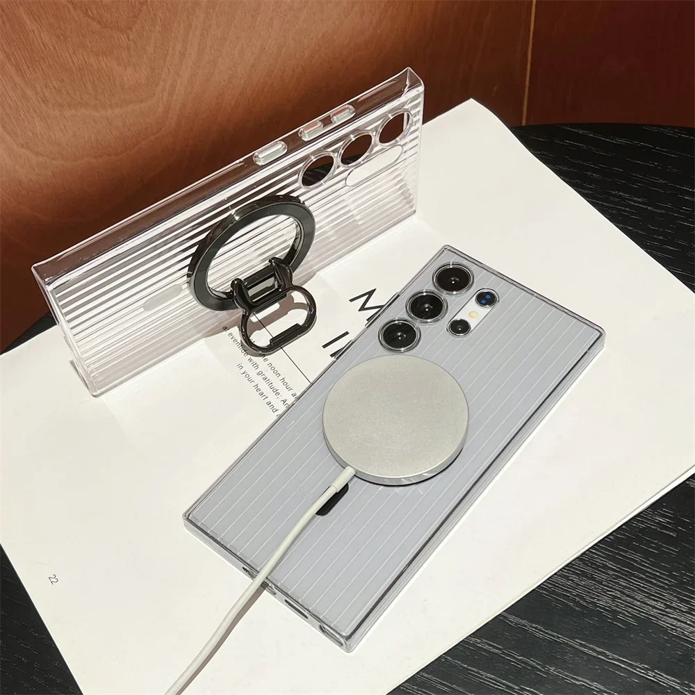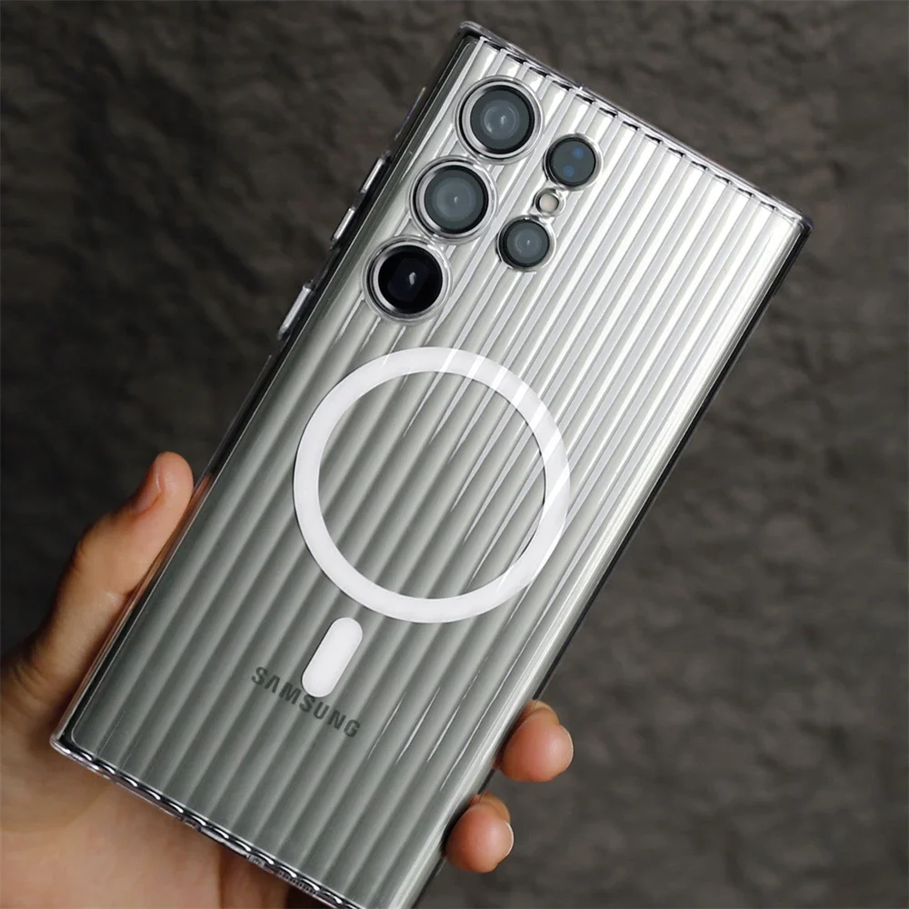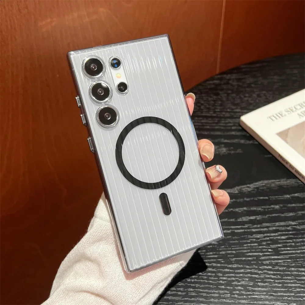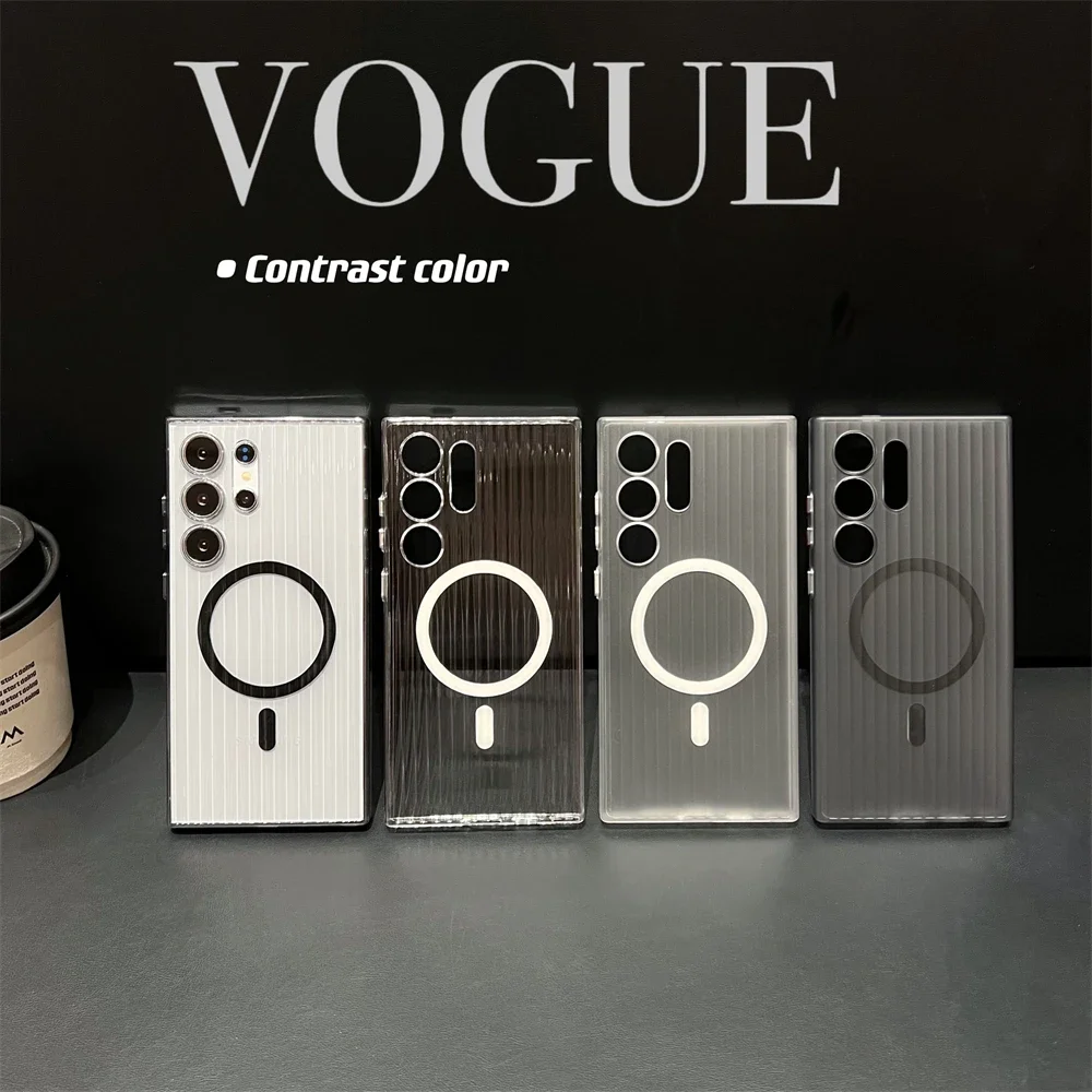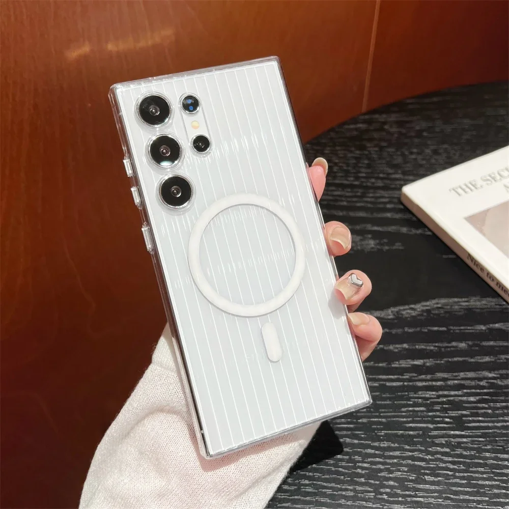 Luxury Hard HD Transparent for Magsafe Case for Samsung Galaxy S24 S23 Ultra Plus Magnetic Wireless Charging Stripes PC Cover