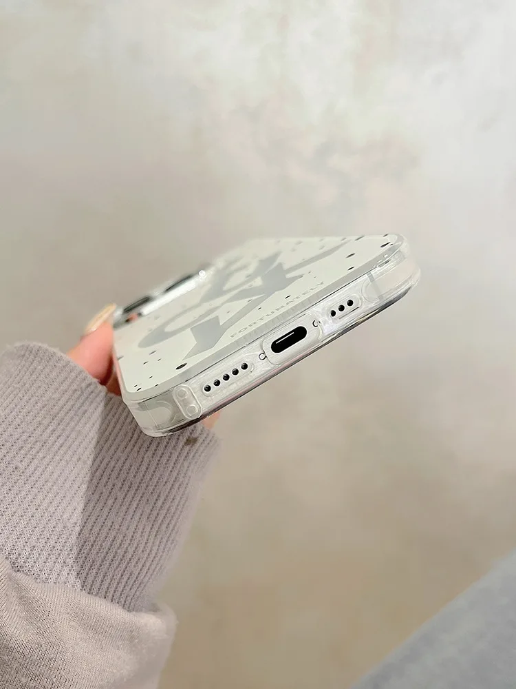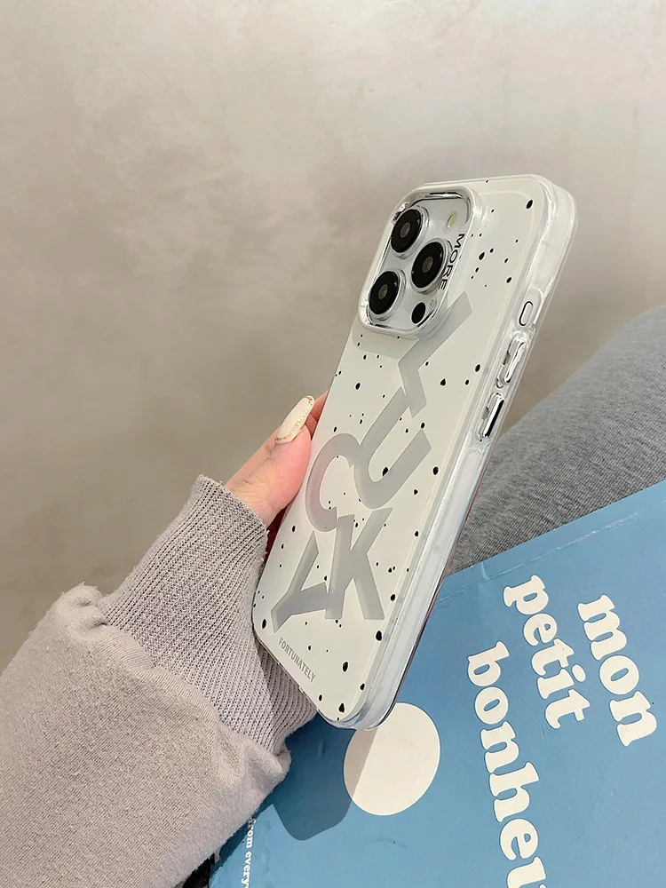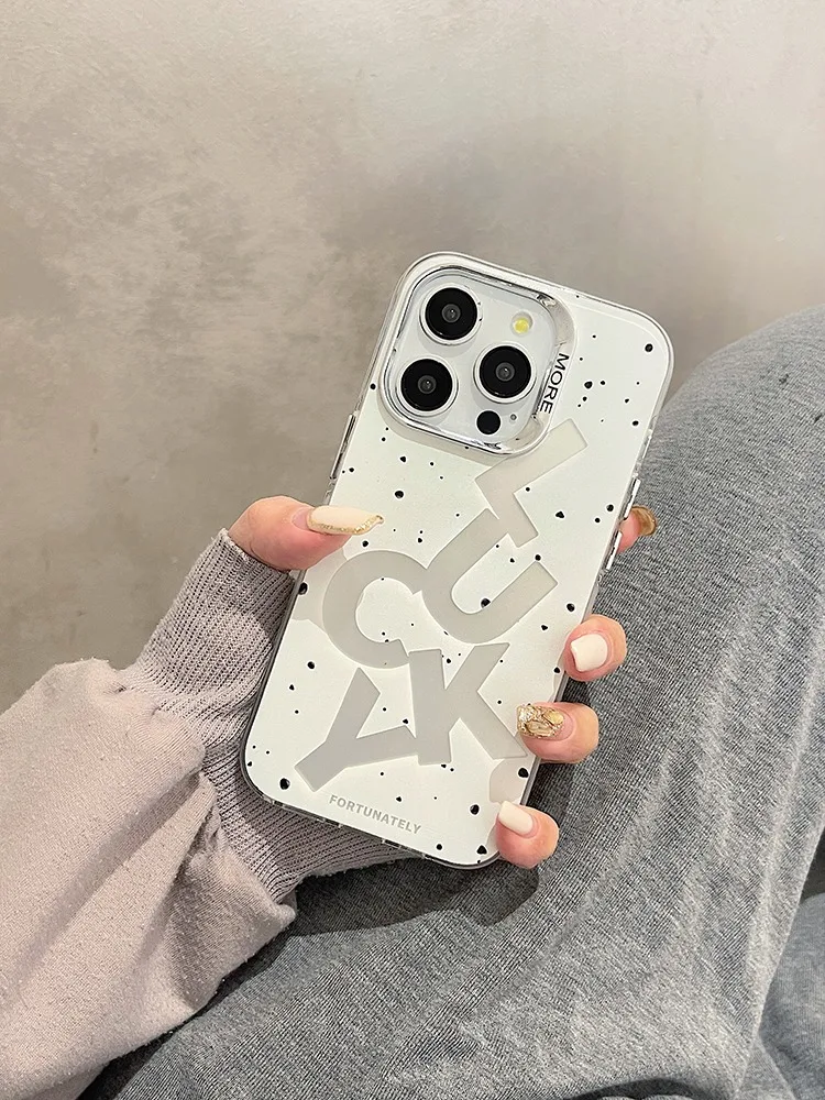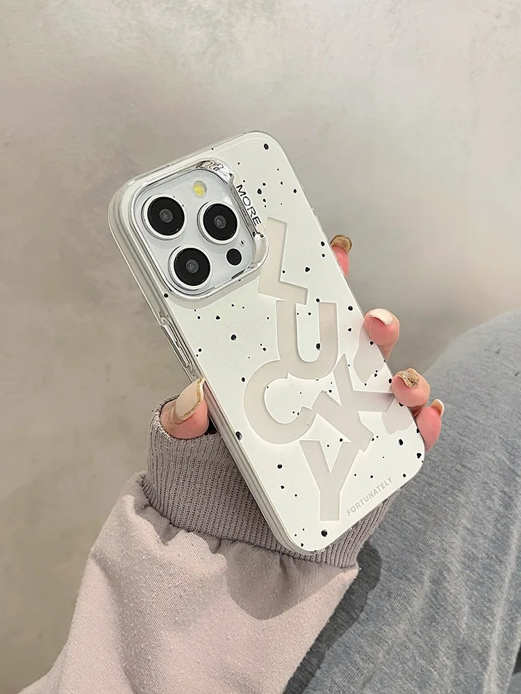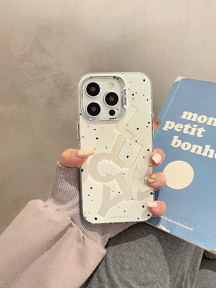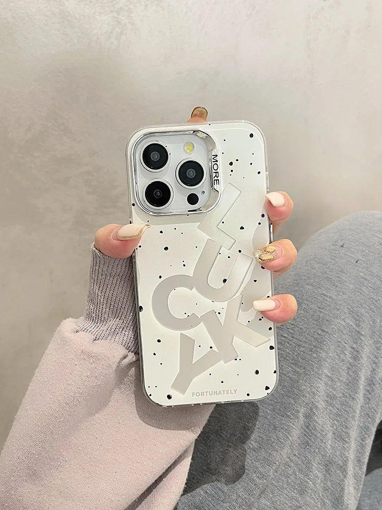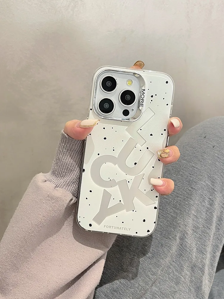 Funda trasera dura con letras de la suerte blancas a la moda para iPhone 11 12 13 14 15 Pro Max, protección plateada para cámara