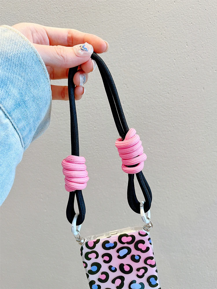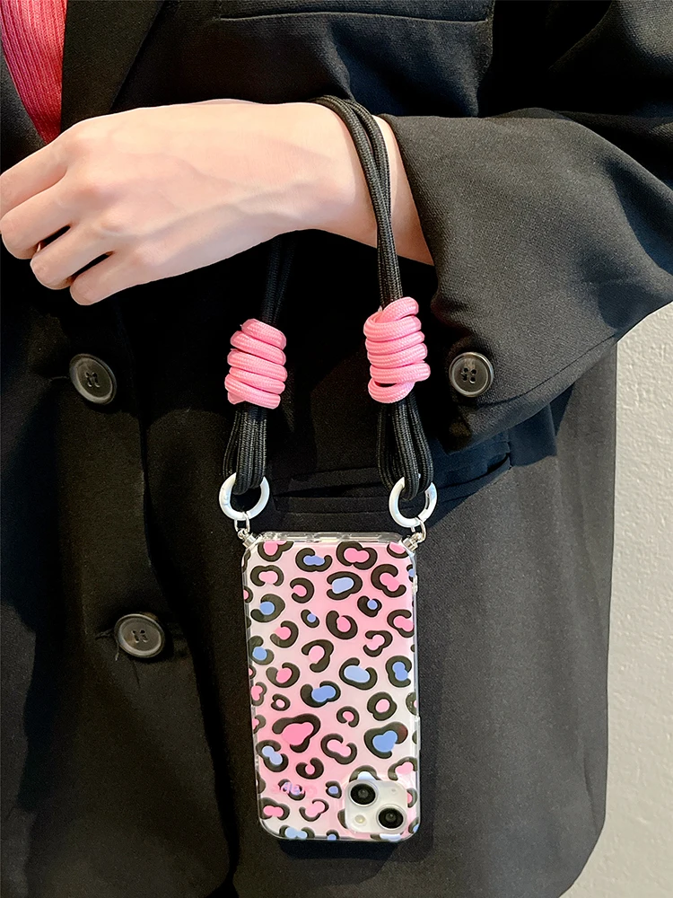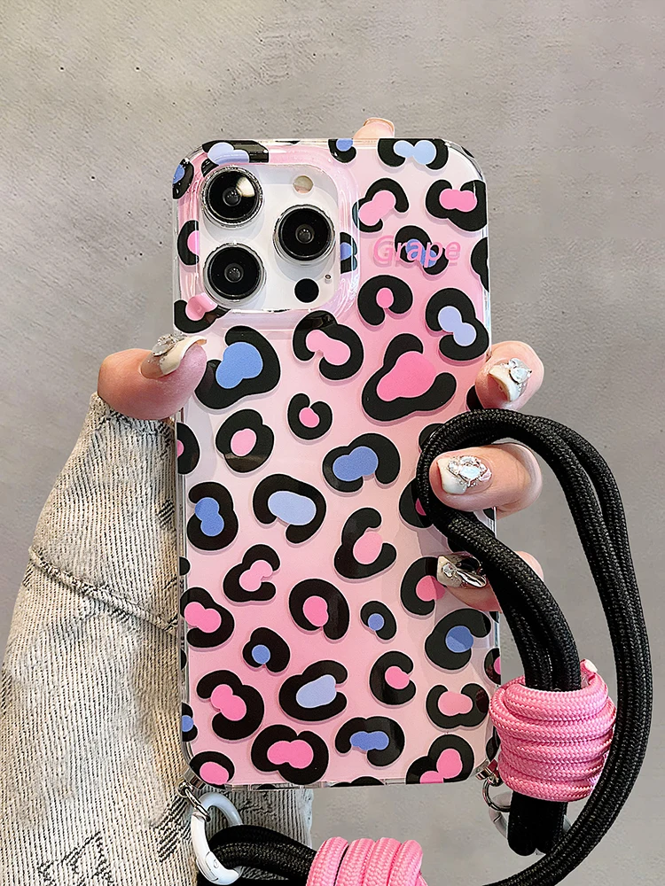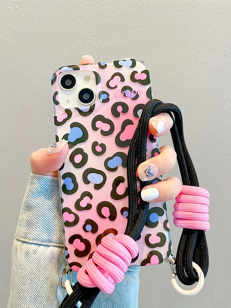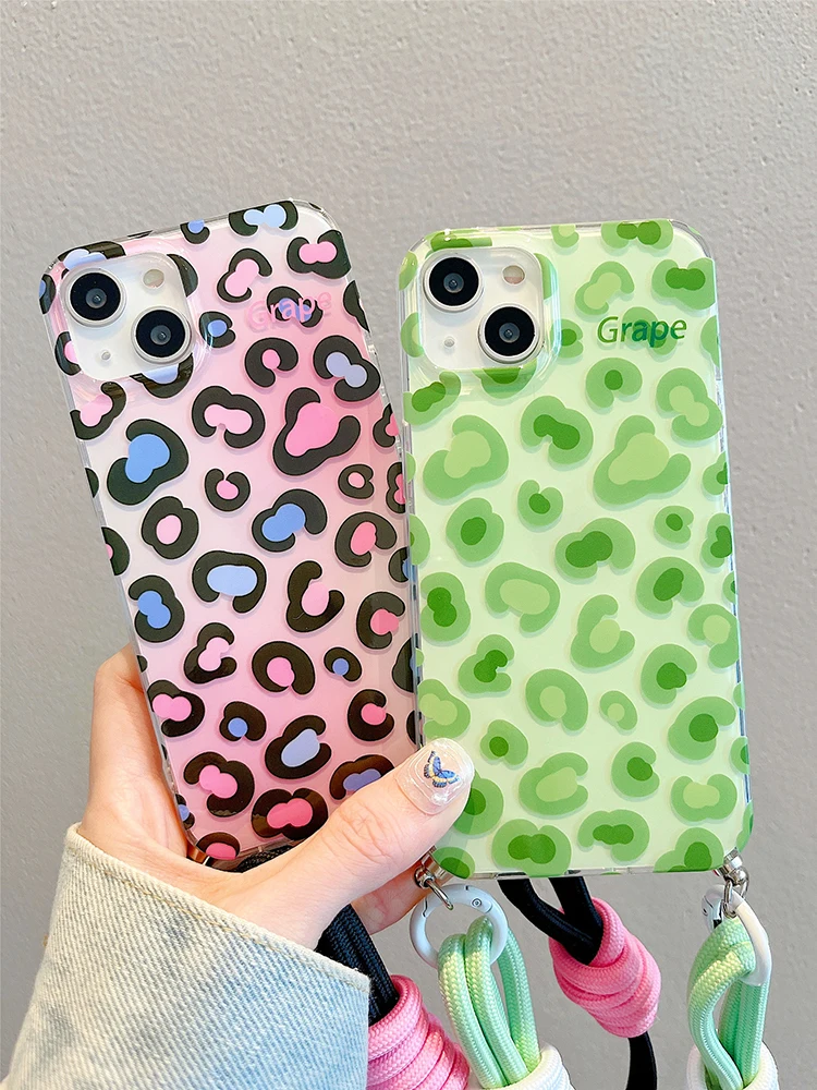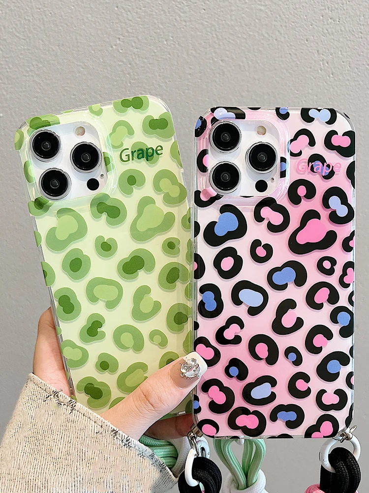 Comprar Funda trasera de leopardo rosa y verde con correa de mano para iPhone 14, 13, 11, 12 Pro Max, encantadora Funda con cadena para muñeca para niña