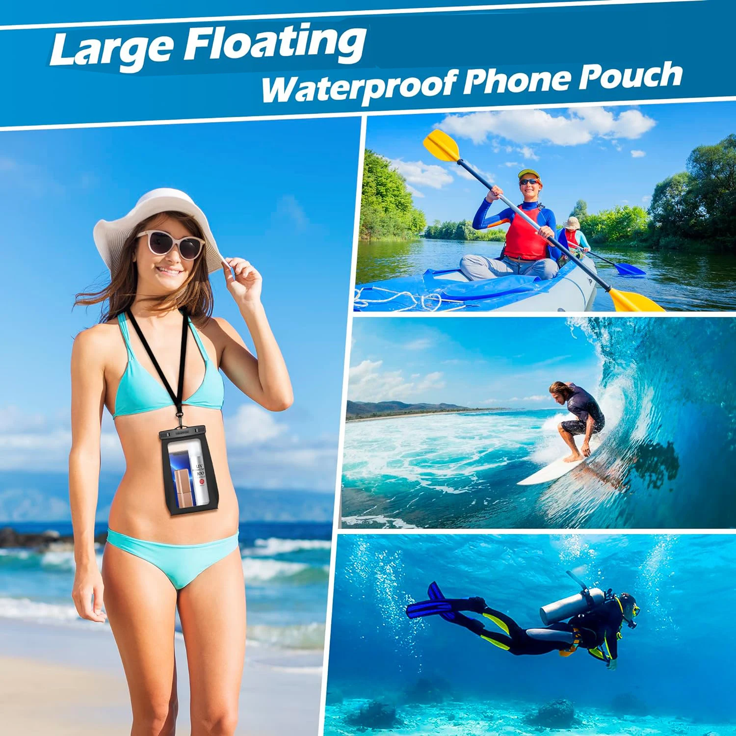El innovador diseño Presentamos flotante triangular: presentamos la mejor funda flotante impermeable para teléfono de alta capacidad. Después de una amplia I + D, nuestros diseñadores han creado un diseño triangular excepcional para maximizar el espacio de almacenamiento. Según los principios de la física, la flotabilidad es igual al peso del agua desplazada. Sorprendentemente, la funda sigue flotando incluso cuando sostiene 3 dispositivos iPhone 14 Pro Max. Esta sola bolsa puede acomodar fácilmente todos los teléfonos inteligentes y artículos valiosos de su familia.