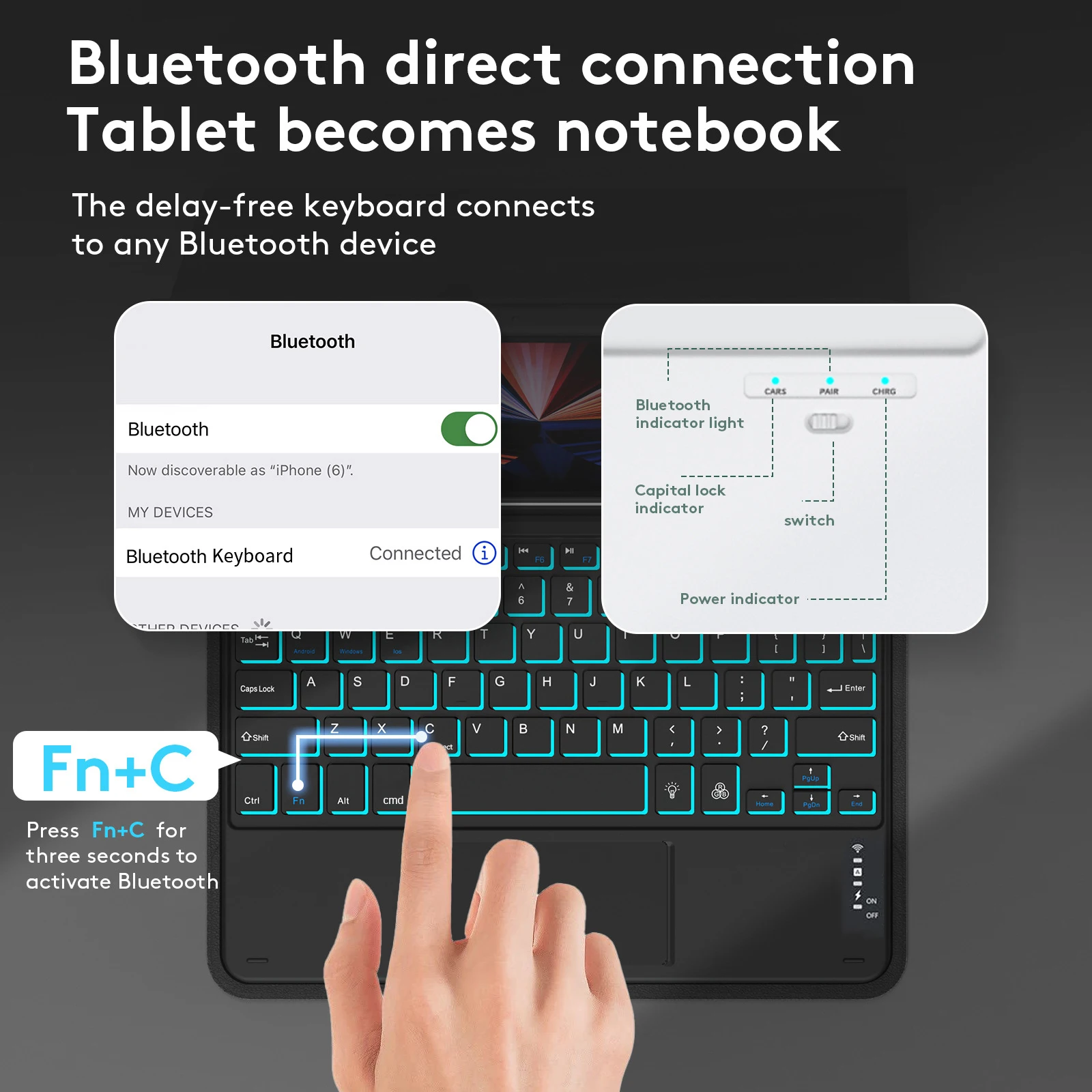 4, Teclado del panel táctil: encienda el teclado, presione Fn+C para y luego busque la conexión Bluetooth con "Teclado" en la lista de Bluetooth del dispositivo.