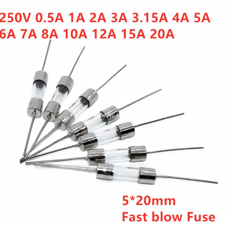 Comprar Fusible de vidrio de soplado rápido, pasador recto de 5x20mm, 5x20mm, 250V, 0.1A, 0.5A, 1A, 2A, 3A, 3.15A, 4A, 5A, 6A, 8A, 10A, 12A, 15A, 20 Uds.