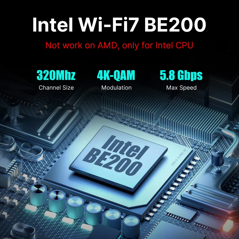 【Nueva tecnología Wi-Fi 7 】 Adopta el chip Intel Be200, WiFi 7 admite un ancho de banda máximo de 320 MHz y las especificaciones del canal de 320 MHz son el doble que las generaciones anteriores de WiFi.