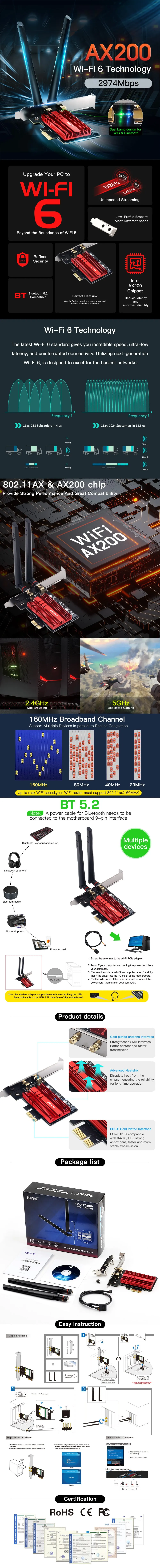 FENVI 3000Mbps Wifi 6 Intel AX200 PCIE tarjeta Wi-fi 802.11ax 2,4G/5Ghz para Bluetooth 5,2 banda Dual escritorio PCIe WiFi adaptador PCI-E inalámbrico