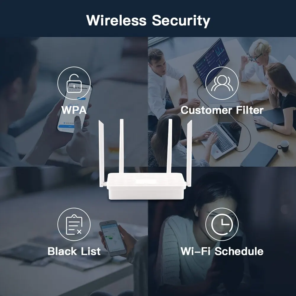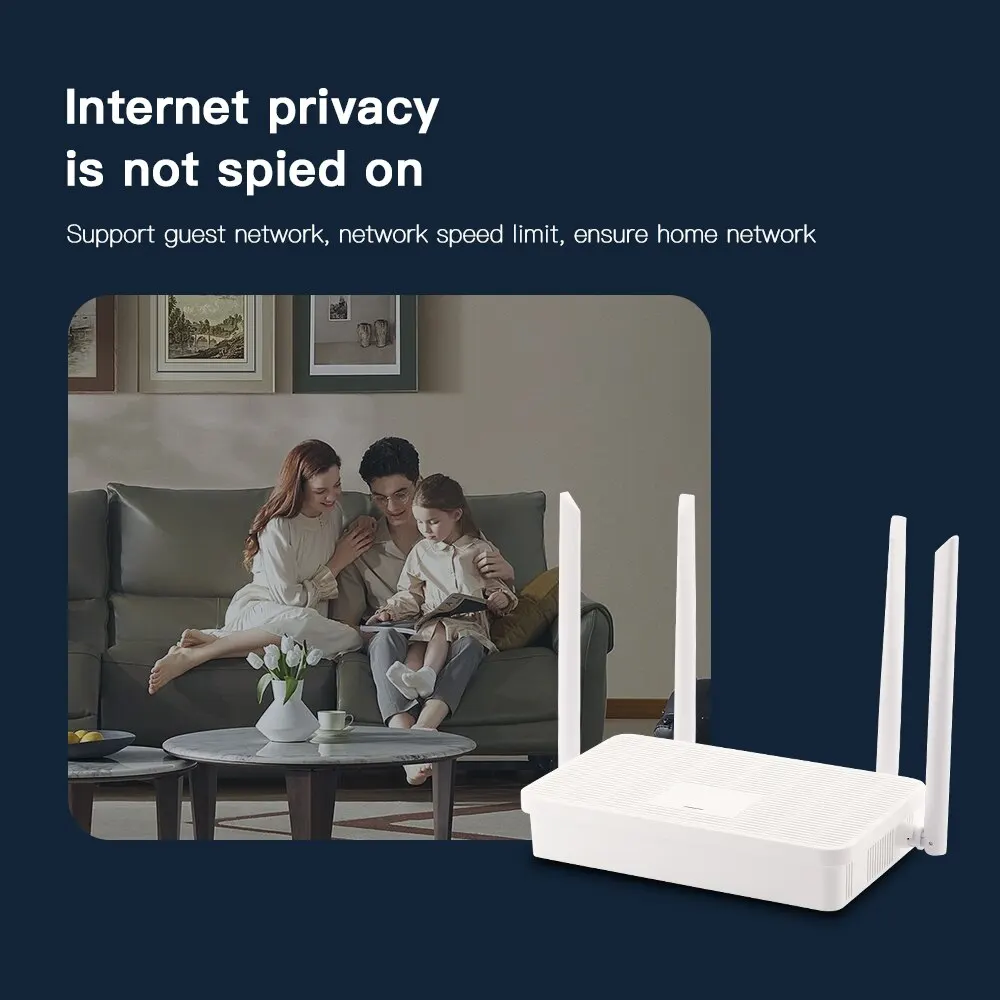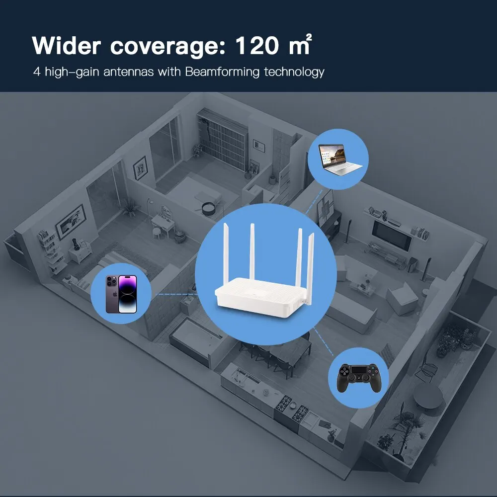 • Antenas robustas:Equipado con antenas 4x5dBi, este enrutador garantiza una recepción de señal fuerte y una cobertura de red óptima en toda su casa.