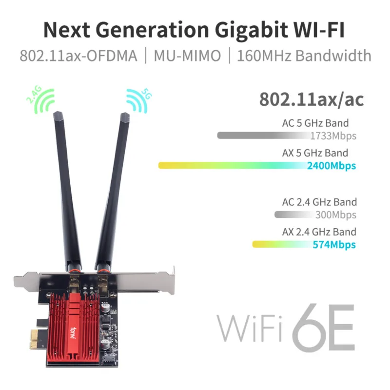 Velocidad de hasta 2400Mbps(5Ghz), Mbps 574 (2,4 Ghz)(el enrutador debe estar en 160Mhz, compatible con 802.11ax)