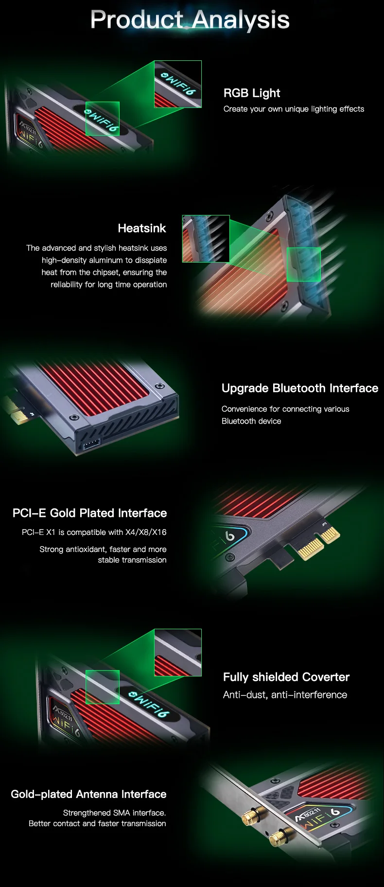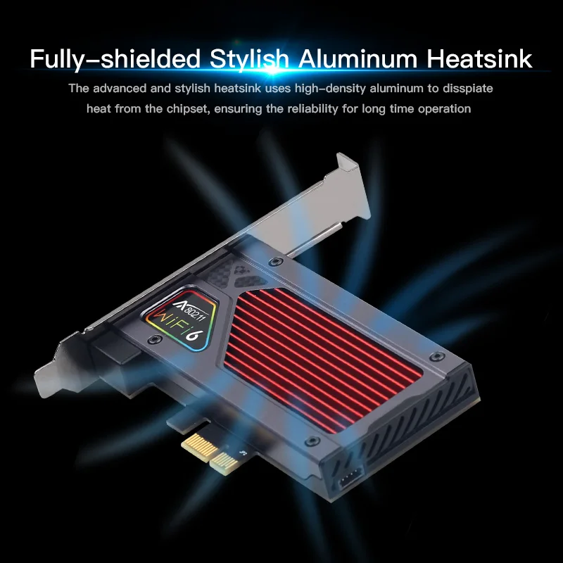 Como adaptador Wi-Fi 6, es compatible con 802.11ax sobre 2x2 antenas de 2/2 y un ancho de banda máximo de 2,4 Gbps, con soporte para las bandas de 5 GHz y 2,4 GHz.
