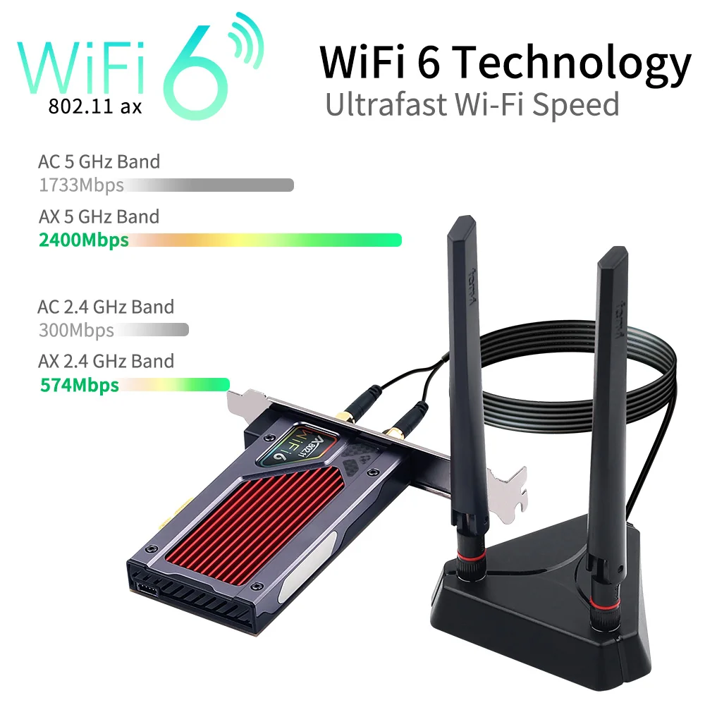 Velocidad de hasta 2400Mbps(5Ghz), Mbps 574 (2,4 Ghz)(el enrutador debe estar en 160Mhz, compatible con 802.11ax)