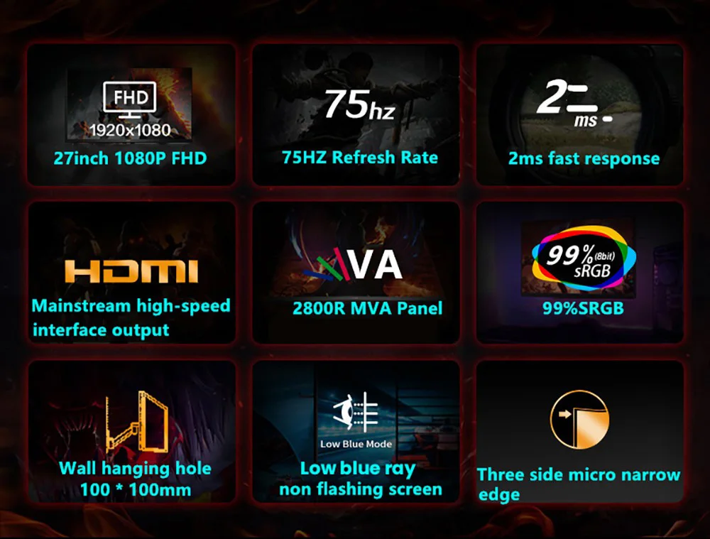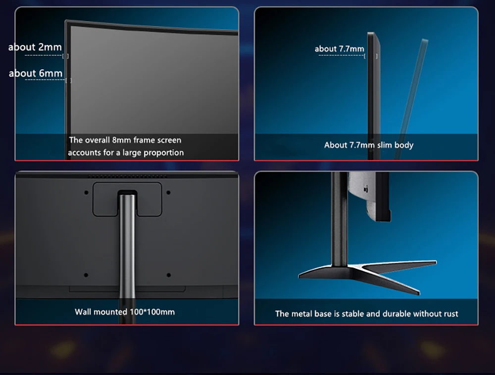 FYHXele 1920 está equipado con un panel HVA curvo de resolución FHD de 1080 x. Relación de aspecto 16:9, ángulo de visión de 178 °, frecuencia de actualización de 75Hz.