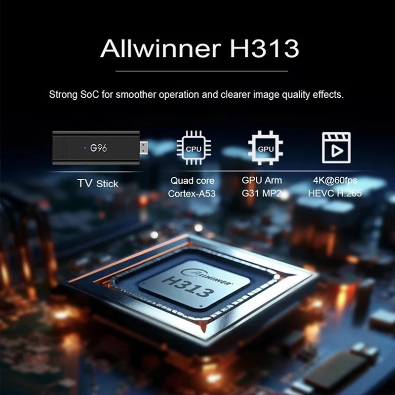 • Procesador AllwinnerH313 Quad Core Cortex A53: equipado con el procesador AllwinnerH313 Quad Core Cortex A53, este Smart TV stick garantiza un rendimiento rápido y eficiente.