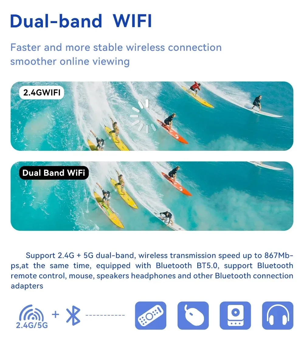 • Conexión Wi-Fi 5G: equipado con Wi-Fi 5G, este Smart TV stick proporciona una conexión a Internet estable y de alta velocidad, lo que garantiza una experiencia de transmisión ininterrumpida.