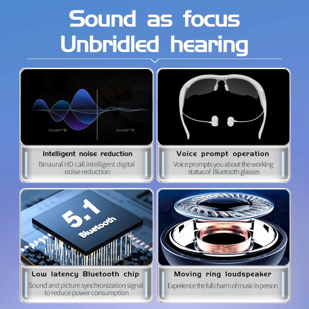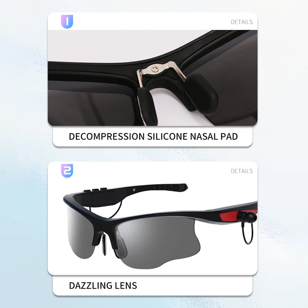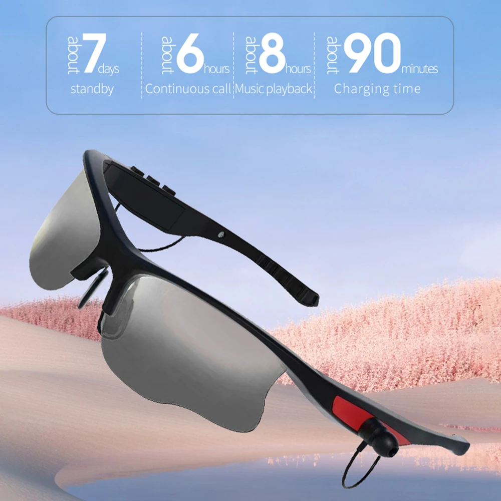 Características:1. Tecnología de audio direccional, llamada de alta definición de auriculares, utiliza la última tecnología de audio direccional para proyectar el sonido altamente direccional cerca del oído, creando un espacio de audio específico, operación clave, conexión del teléfono, reducción inteligente del ruido de la música, llamadas claras, al igual que puede dejar su teléfono, Y haga una llamada mientras conduce.2. Suficiente potencia para garantizar una larga vida útil, batería de polímero de litio con batería dual de gran capacidad de 100 mAhx2, gran vida útil.3. Excelente calidad de sonido, experiencia auditiva sublime, Unidad de altavoz AAC, reduce la pérdida de transmisión y te ofrece música de alta calidad y un impactante Campo de sonido envolvente.4. Conéctese inmediatamente después de usar, encienda y apague cuando use, encienda y apague automáticamente cuando use gafas, conecte automáticamente el equipo emparejado, quite las gafas y se detendrá automáticamente después de 15 segundos.5. Bluetooth 5,1 ha explotado en rendimiento. La nueva generación de Bluetooth ha mejorado enormemente el consumo de energía y la señal, haciendo que la transmisión inalámbrica se acerque a la sensación de cableado.6. Lentes polarizadas, tecnología abierta y moda, nueva integración de moda y tecnología, es decir, gafas de alta definición y auriculares Bluetooth.7. Diseño de adsorción magnética, los auriculares cerca de las gafas se absorben automáticamente.8. Aplicable a una variedad de escenarios: conducción, ciclismo, deportes al aire libre y salidas.Especificaciones:1. Bluetooth: 5,12. Soporte de música: 8 horas de reproducción de música continua3. Soporte de llamadas: 6 horas de llamada continua con micrófono4. Rango de conexión inalámbrica: 10m5. Tiempo en espera: 7 díasLista de embalaje1 * Gafas1 * Cable de datos1 * paño de gafas1 * caja de gafas1 * Instrucciones