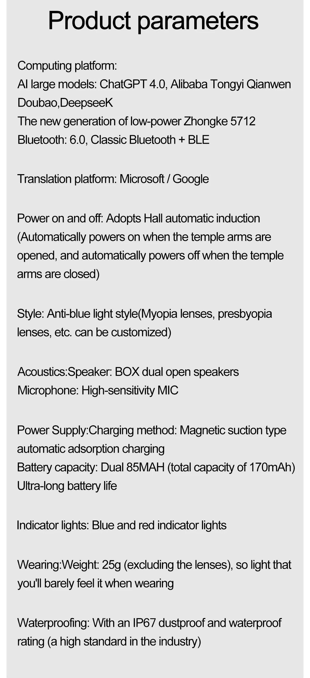 Gafas inteligentes de moda de comunicación de audio Bluetooth AI: traducción inteligente de voz y video en tiempo real de IA, diálogo y preguntas y respuestas de IA, traducción inteligente de IA (modo de máquina de traducción, gafas + modo de traducción de teléfono). Puede traducir más de 163 idiomas), nota de voz, modo de ayuda para dormir, traducción de fotografías, control remoto de fotografías, comunicación Bluetooth, encendido/apagado automático del sensor Hall inteligente, asistente de voz inteligente, reproducción de música (cambio, apreciación de música en pausa), uso bajo- Chip AB5712F de potencia, reducción de ruido ENC, latencia ultrabaja, duración de la batería de larga duración, peso ligero de 25 g, cómodo de llevar, gafas de sol configurables, luz azul, vista cercana y otras lentes