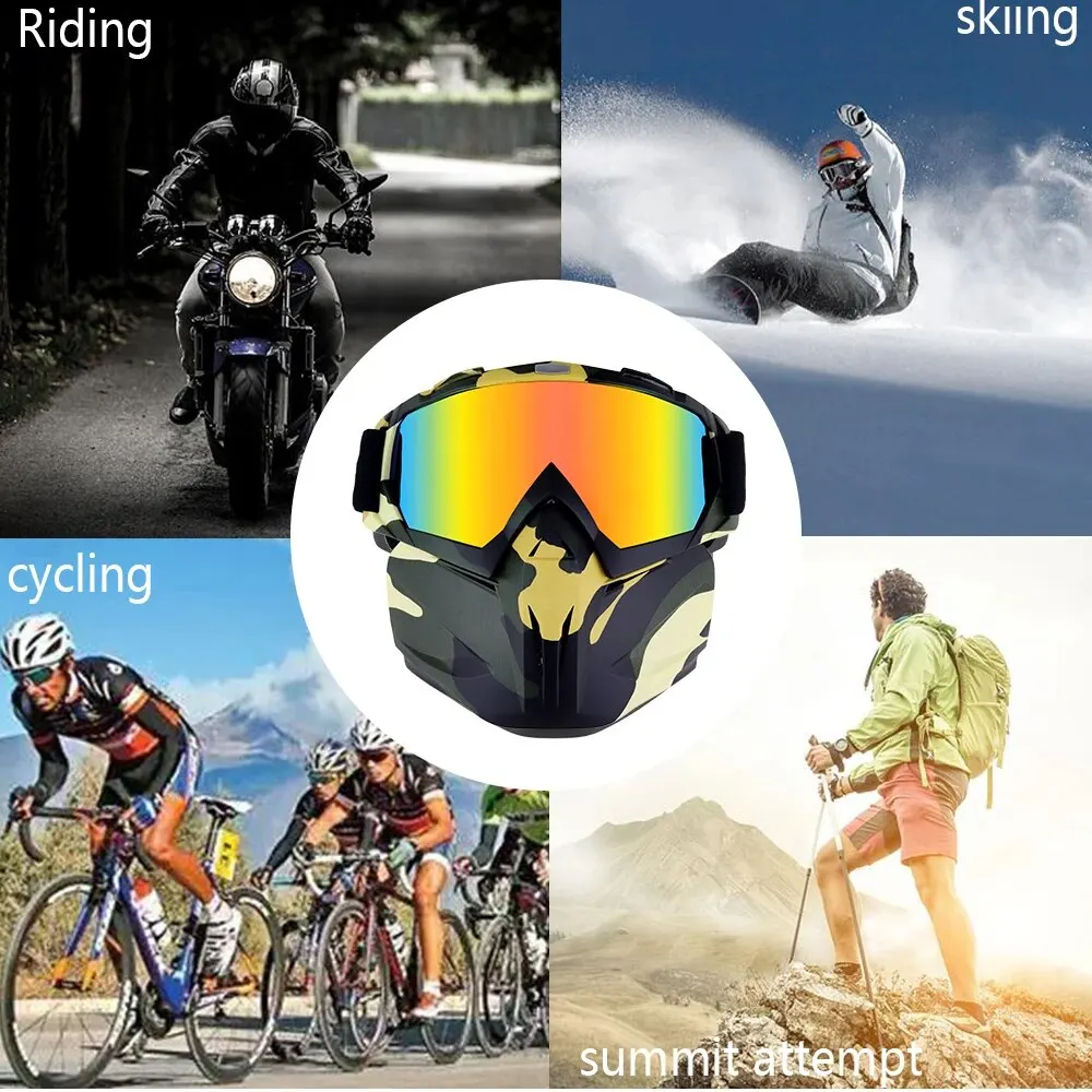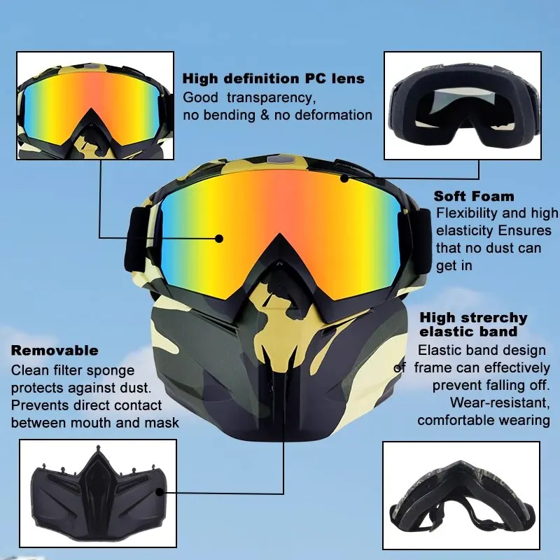 【Máscara desmontable a prueba de viento y polvo】Las gafas de moto con máscara desmontable no solo aumentan el área de protección, sino que también protegen mejor contra el viento y el polvo, e incluso ayudan a prevenir la niebla. Y las gafas se pueden usar por separado según sea necesario.