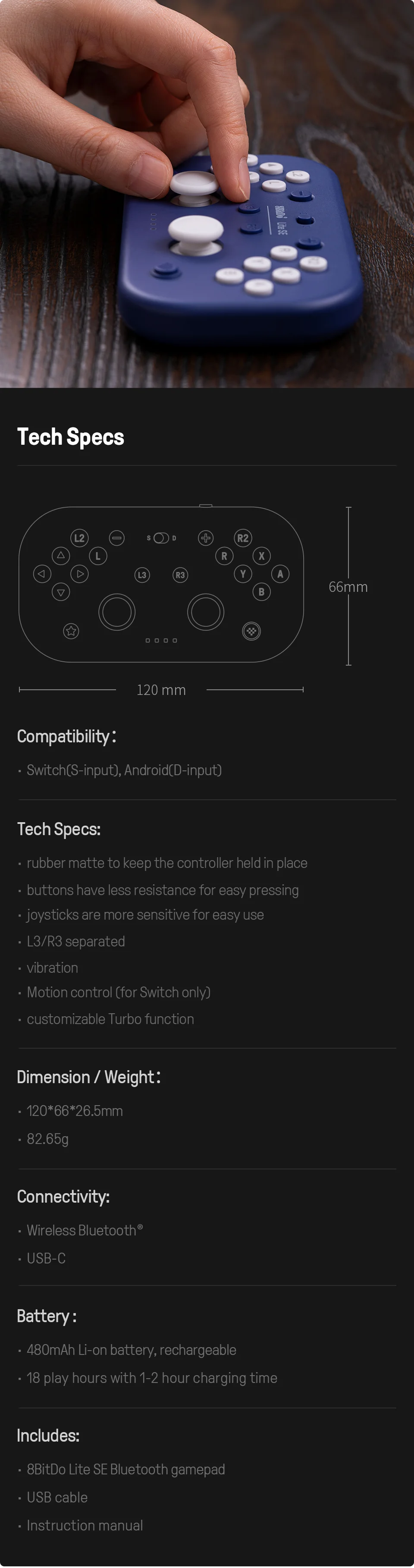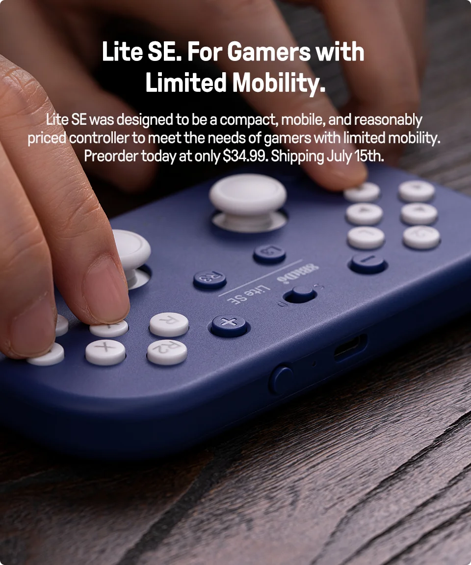 Lite SE was created in collaboration over the last year with two passionate members of the 8BitDo community: father and son, Andreas and Oskar Karlsson. It has been 8BitDo’s pleasure to collaborate with Andreas and Oskar and engineer a controller to meet the needs of passionate gamers with limited mobility like Oskar. Watch the video below for the story.