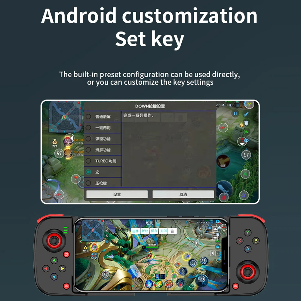 Feature: Multi-Platform Compatibility - Support for Android iOS iPhone PS4 Switch Steam PC function. For Android Custom Settings Button - Built-in preset configuration can be used directly, or you can customize the button settings. One-click macro operation - macro definition, one-click display of heroes. Set of combos, famous sword resurrection armor, one-click operation. Ergonomic, Curved Design - Professional grip design, firm handle. Convenient and fits the palm of the hand. Innovative two-stage stretch structure - portable and compatible with large-screen mobile phones, stable and not loose. Can stretch 135-173mm/5.31-6.81in. 360° high-precision 3D joystick - no slippage. Adopt a million-time life high-precision rocker without dead zone. One-click speed adjustment, easy micro-manipulation and aiming - The M2 key on the back can realize speed adjustment, assist players to complete a series of difficult operations such as fine-tuning, aiming, headshot, etc., making it easier for you to get started and lock the game. Long-lasting battery life - game while charging, built-in 400mAh large battery, and the external Type-C fast charging handle is continuously charged. Exquisite details - Delicate keys: The keys are processed with backlight, the target is clear, not dazzling, and the key span is small and easy to operate; borderless design: allows us to adjust the volume and other issues more easily in the game; upgrade groove design: product placement There is a 1.3mm concave at the mobile phone, which can effectively protect your mobile phone camera and prevent the camera from scratching. Specification: Product Name: Stretch Gamepad Item model number: D3 Connection method: wireless connection Interface type: Type-C Product material: ABS Working power: 400mAh OS: for Android/Apple Product size: 85x42x208mm/3.35x1.65x8.19in Product weight: 168g 8 major features: Bluetooth-compatible 5.0 Long battery life For Apple Direct Connection Multi-platform compatible For Android Direct Connection Small and convenient No delay Macro definition back key Note: Due to the different monitor and light effect, the actual color of the item might be slightly different from the color showed on the pictures. Thank you! Please allow 1-2cm measuring deviation due to manual measurement. 1 x charging cable 1 x Manual ![]() ![]() ![]() ![]() ![]() ![]() ![]() ![]() ![]() ![]() ![]() ![]() ![]() ![]() ![]() ![]() ![]() ![]() ![]() ![]() ![]() ![]() ![]() ![]() ![]() ![]() ![]() ![]() ![]() ![]() ![]() ![]() ![]() ![]() ![]() ![]() ![]() ![]() ![]() ![]() ![]() |