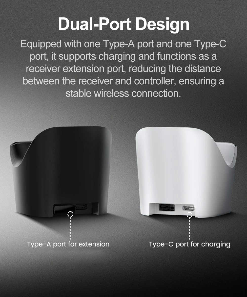 Equipado con un puerto tipo A y un puerto tipo C, admite carga y funciona como un puerto de extensión del receptor, lo que reduce la distancia entre el receptor y el controlador, asegurando una conexión inalámbrica estable.