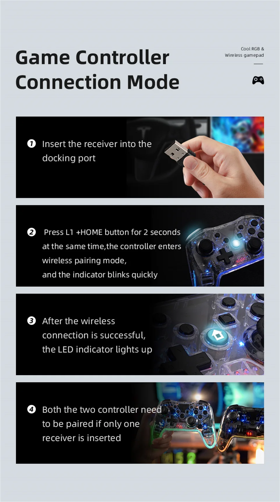 2) Presione el botón L1 + HOME durante 2 segundos al mismo tiempo, el controlador entra en el modo de emparejamiento inalámbrico y el indicador parpadea rápidamente