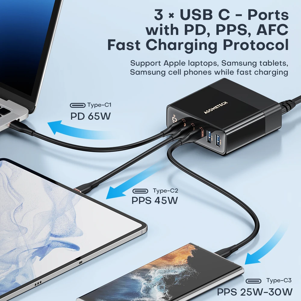 Salida 1/C3: 5V3A / 9V3A / 12V3A / 15V3A / 20V5A,PPS 3,3-21V=5A,. 3,3-11V=5A (PD 100W Max + PPS Super Fast Charing para Samsung S23 S22 S21 S20 y más)