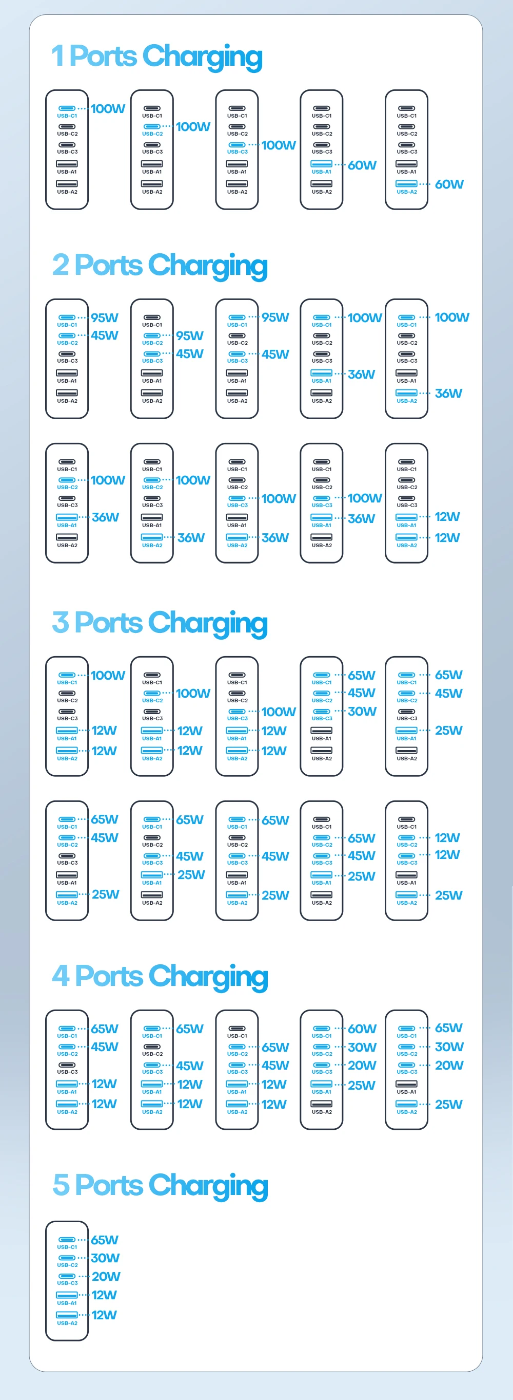 1. + C2 + C3 + A1 / A2 : 65W + 30W + 20W + 25W.