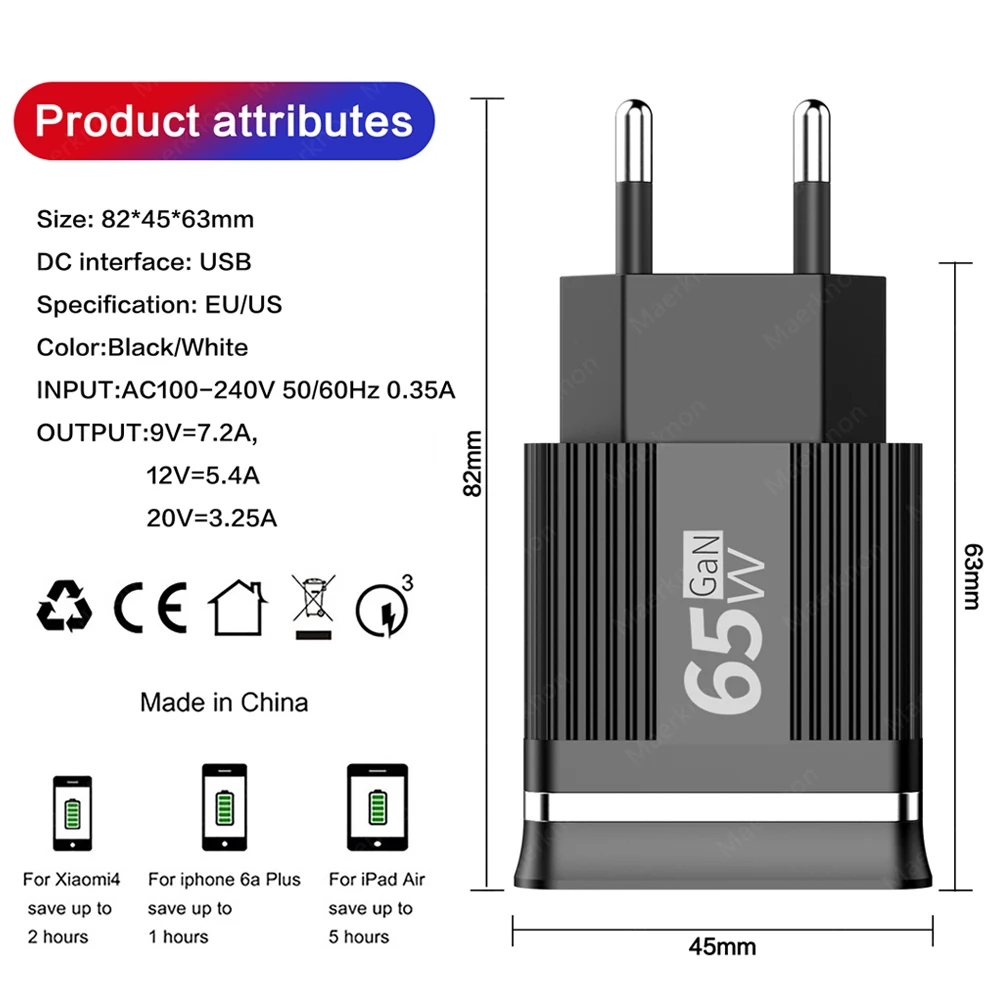 Con una potencia de salida de hasta 65W, puede cargar rápidamente su dispositivo, lo que permite que su dispositivo se recupere en el menor tiempo posible. Ya sea un teléfono móvil u otros dispositivos de carga, hace su vida más conveniente.