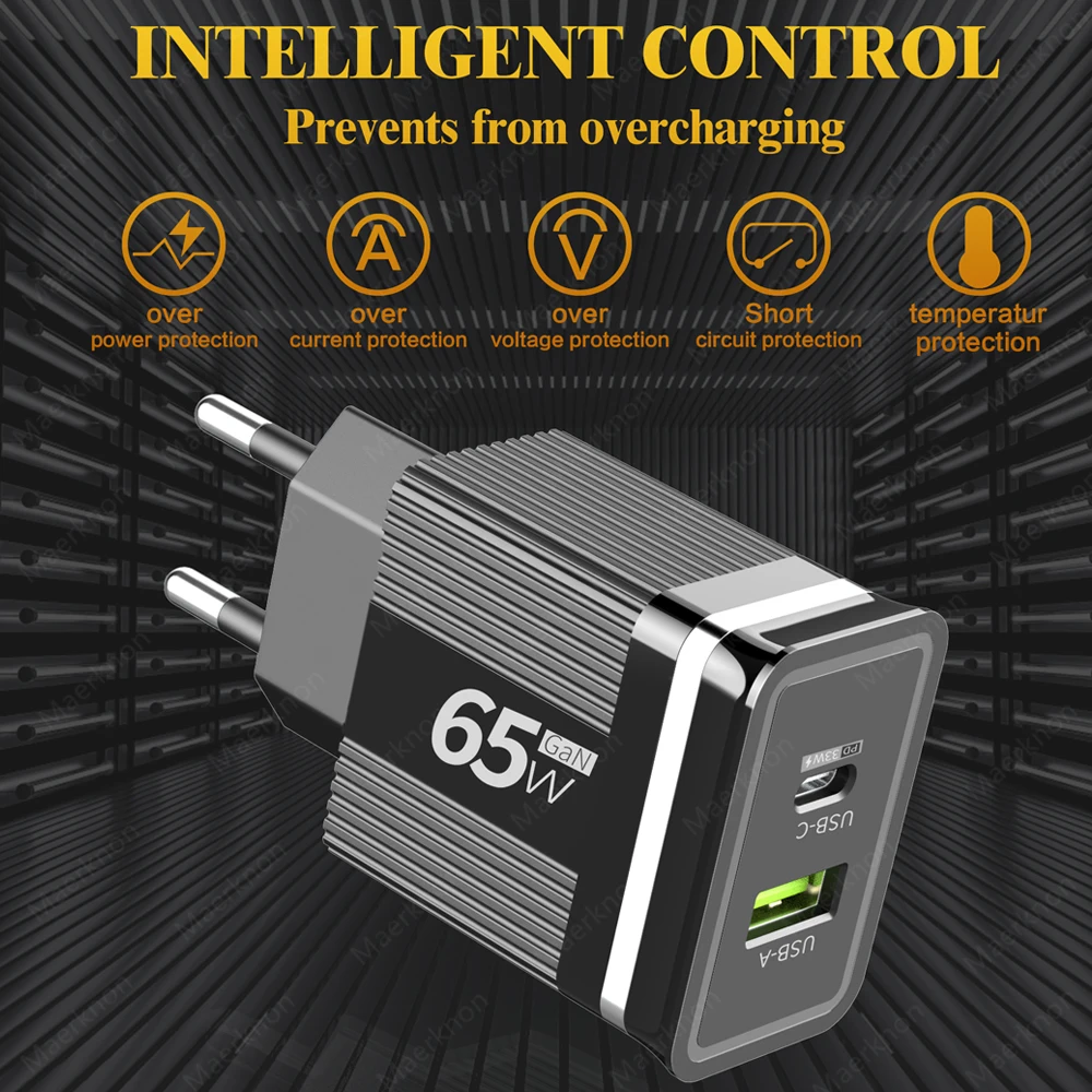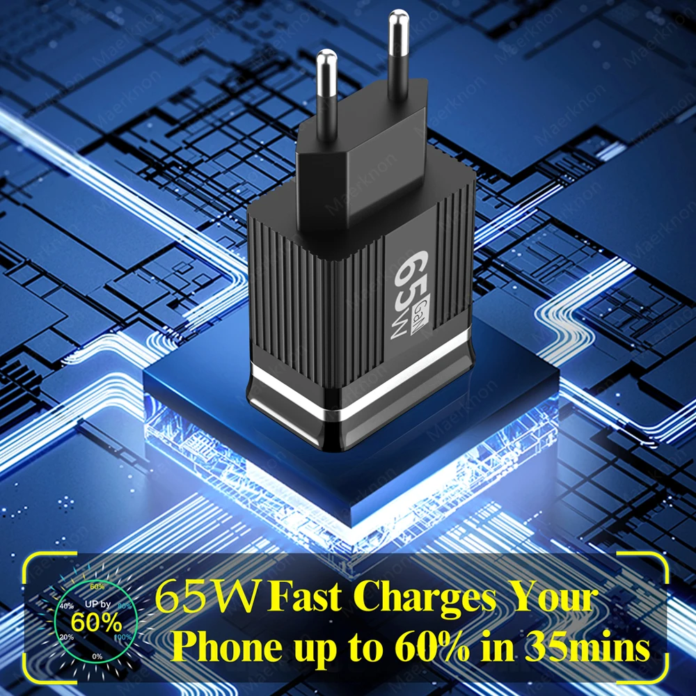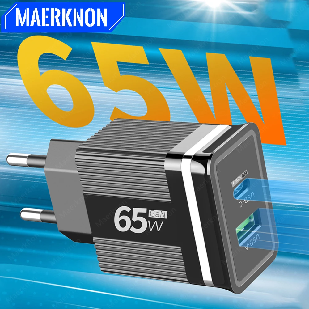 Cargador de teléfono USB GaN de 65W, carga rápida 3,0 tipo C, cargador de pared PD para iPhone, Xiaomi, Samsung, Huawei, enchufe europeo/estadounidense, adaptador de corriente para teléfono