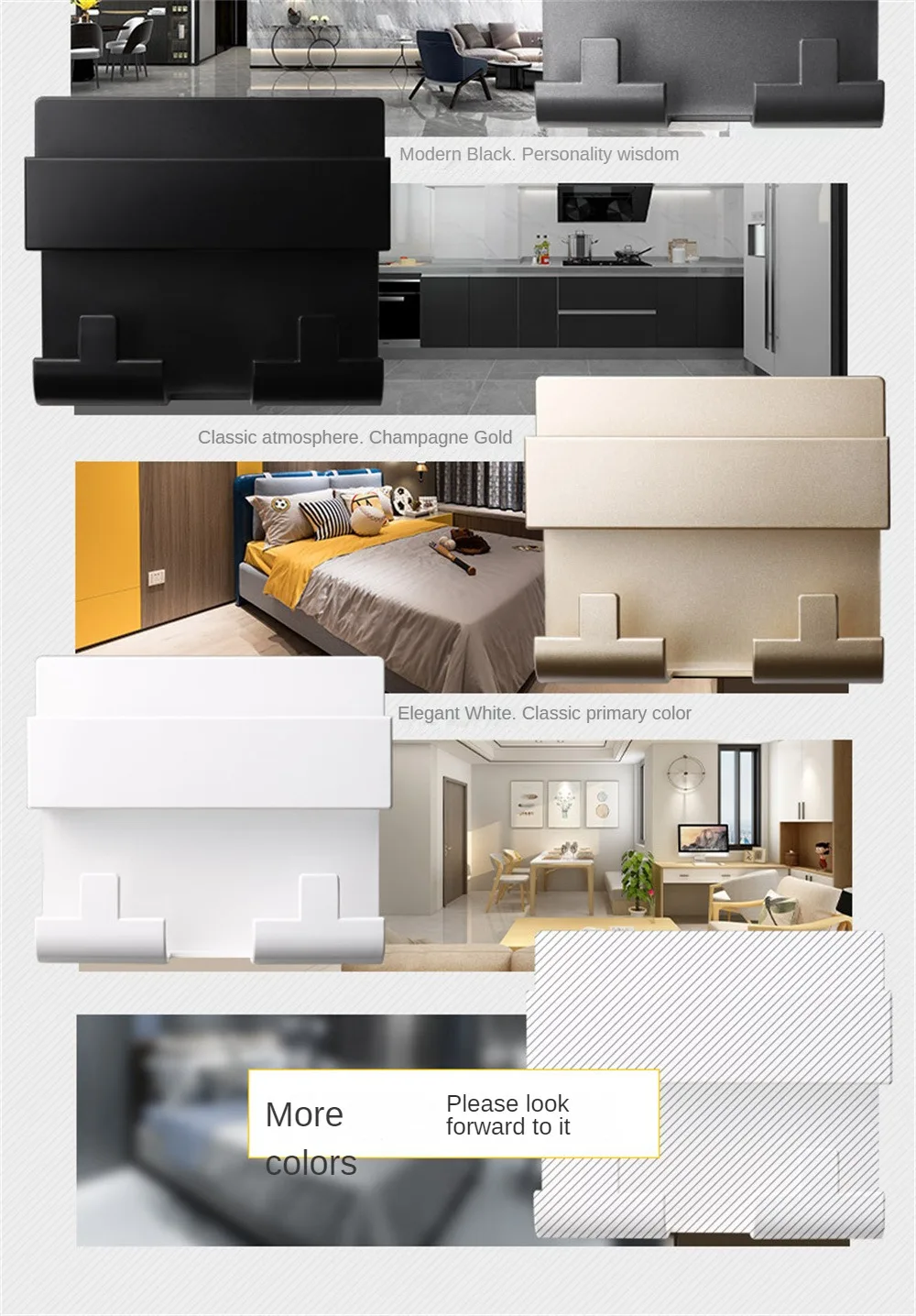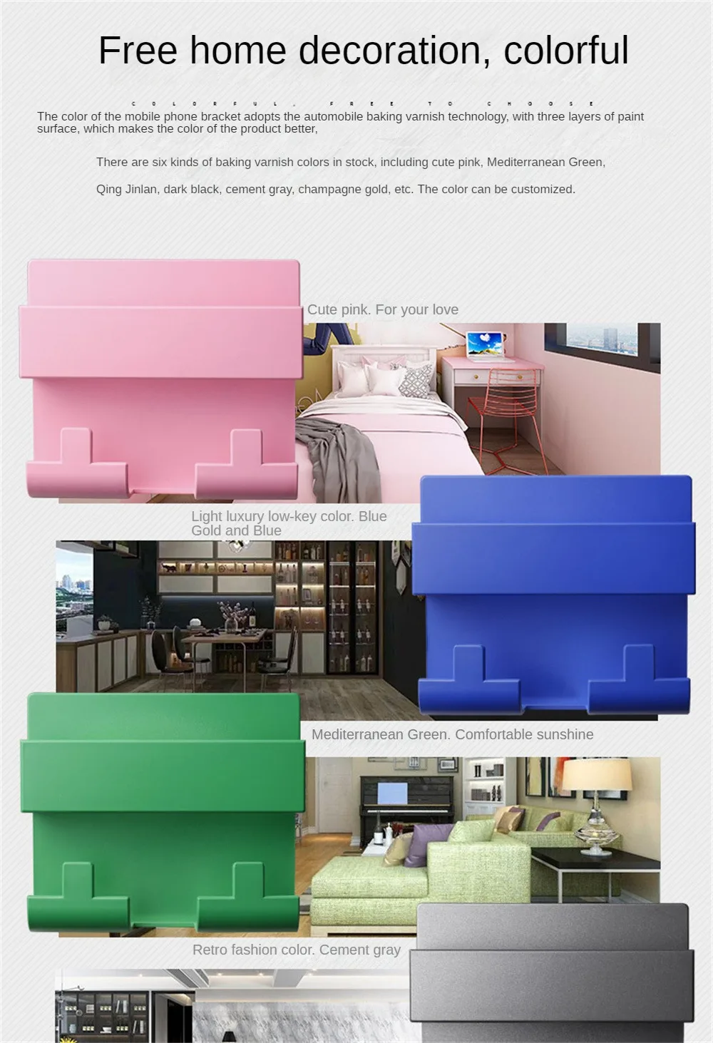 4.Decoración casera gratuita, colorida.El color del soporte para teléfono móvil adopta el proceso de pintura para hornear automóviles, con tres capas de pintura para hacer que el color del producto sea más excelente.Hay seis colores de pintura para hornear, que incluyen rosa encantador, verde mediterráneo, azul dorado cian, negro noche oscuro, gris cemento y dorado champán.