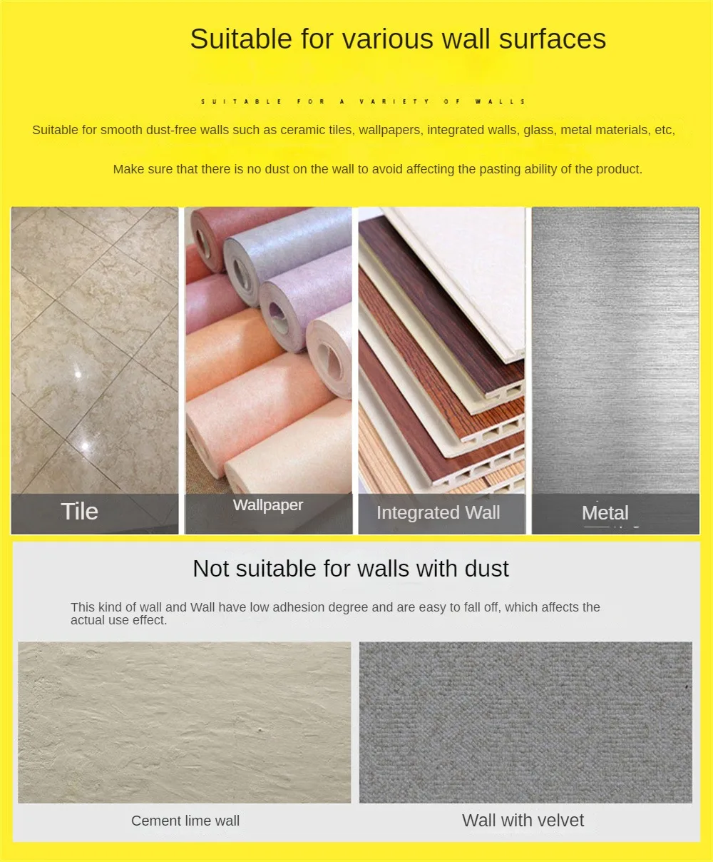1.Es adecuado para una variedad de superficies de paredes, como baldosas de cerámica, papel tapiz, superficies de paredes integradas, vidrio, materiales metálicos y otras paredes lisas y libres de polvo.