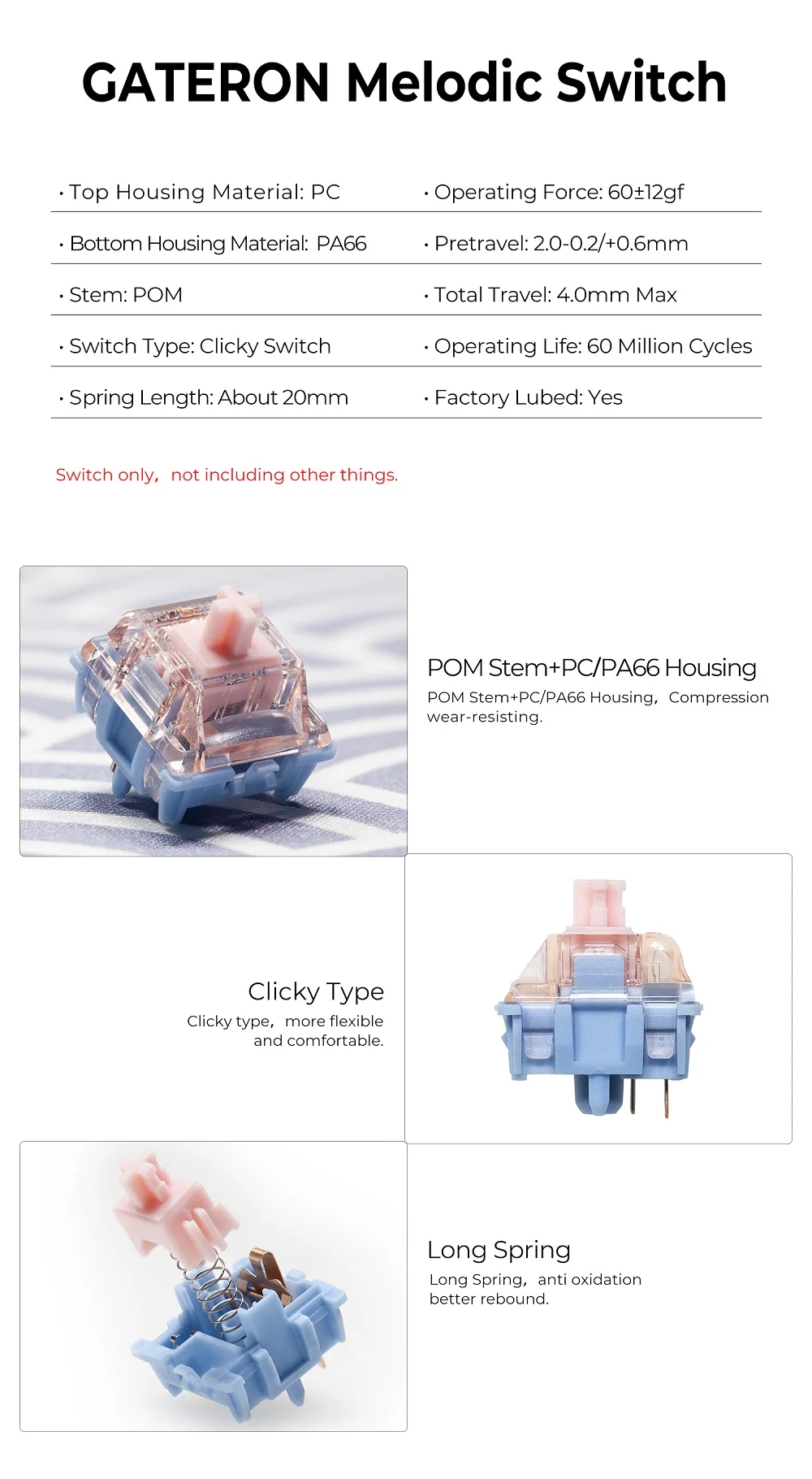 Comprar Gateron interruptor melódico Clicky 60g MX para teclado mecánico, interruptor de fábrica Lubed PC PA66 POM, resorte largo, doble clic de riel