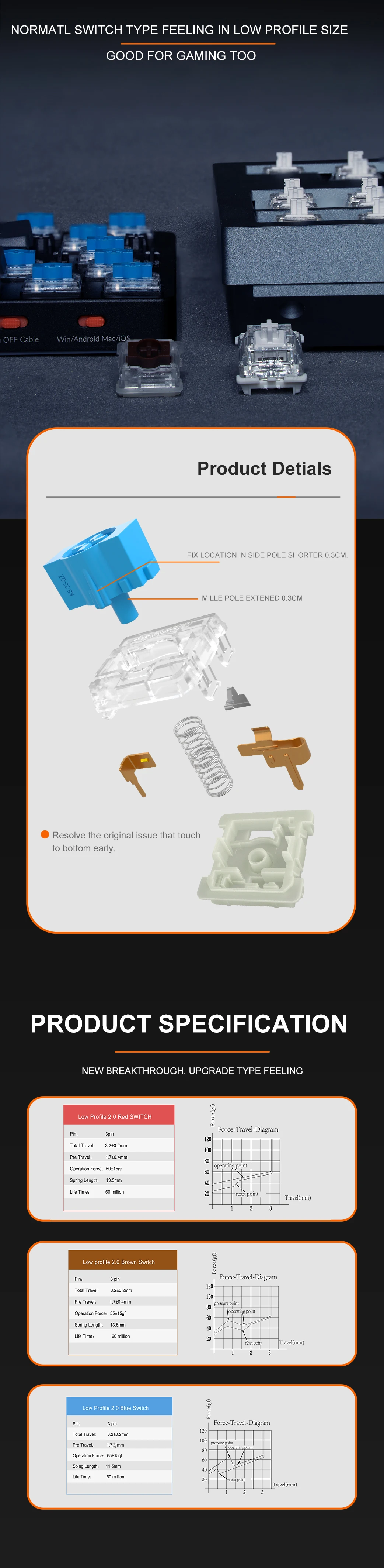 Comprar Gateron-Interruptor de perfil bajo para teclado mecánico GK61, GK87, 3 pines, 2,0 KS-33, rojo, azul y marrón