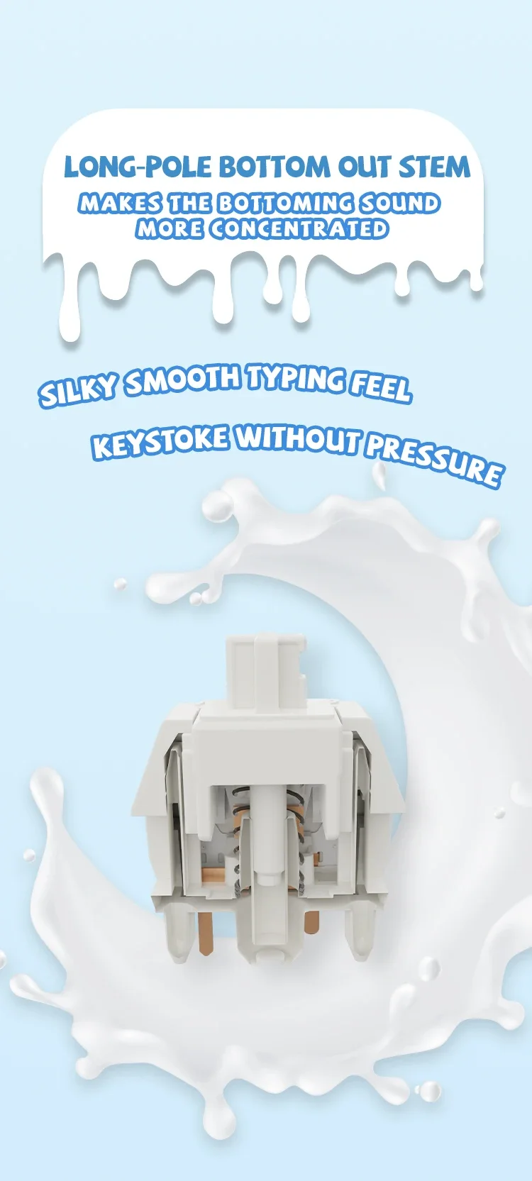 Una característica destacada del interruptor Smoothie es su poste de guía de luz desmontable, lo que permite una configuración de teclado personalizable y visualmente cautivadora. El vástago inferior de polo largo refina aún más la experiencia de escritura, concentrando el sonido de fondo para una retroalimentación auditiva inmersiva y satisfactoria.