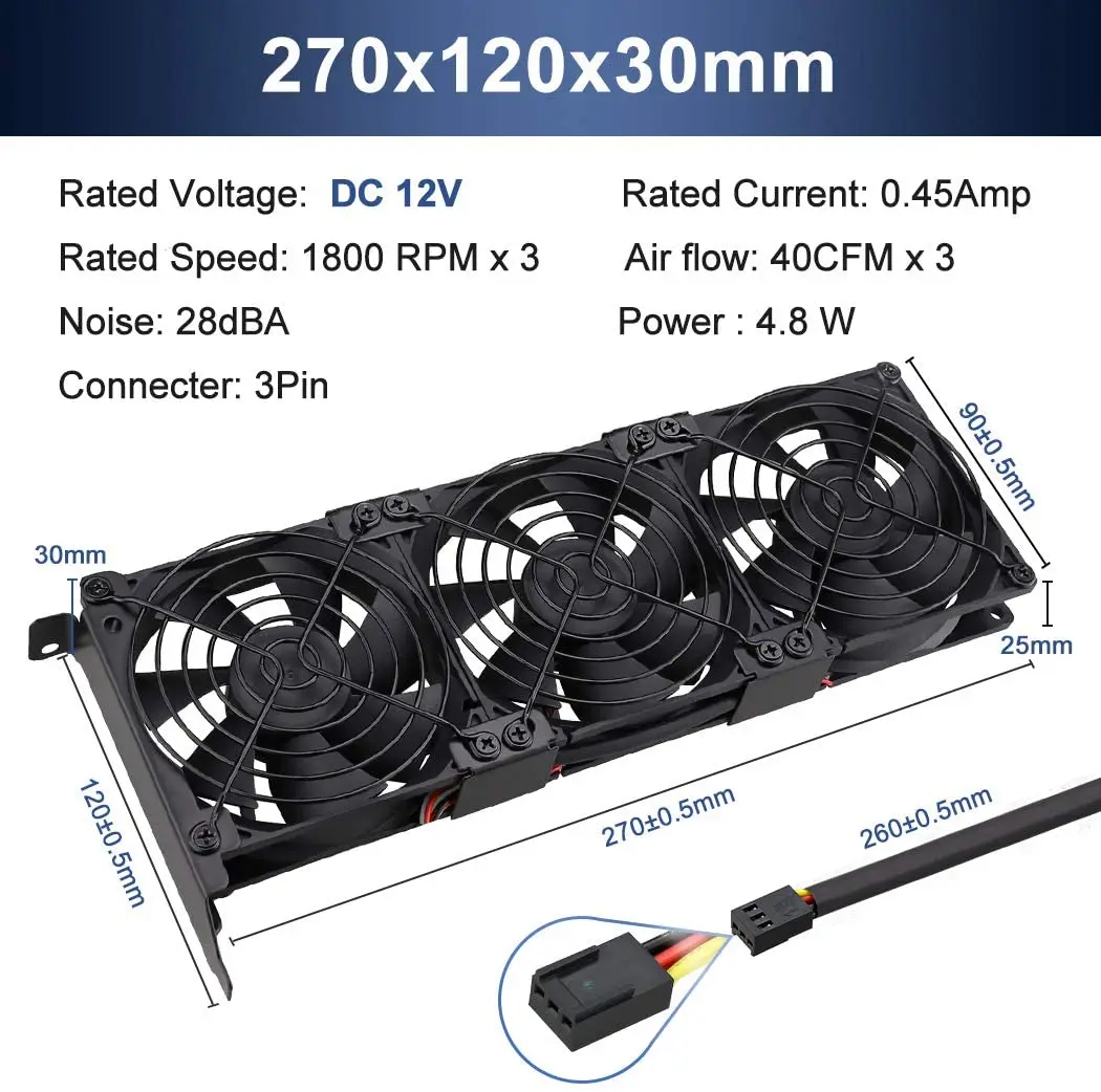 Tamaño total: 3 ventiladores: 276 mm (largo) x 120 mm (ancho) x 30 mm (alto) / 10,86 pulgadas (largo) x 4,72 pulgadas (ancho) x 1,18 pulgadas (alto)2 ventiladores: 185 mm (largo) x 120 mm (ancho) x 30 mm (alto) / 7,28 pulgadas (largo) x 4,72 pulgadas (ancho) x 1,18 pulgadas (alto)