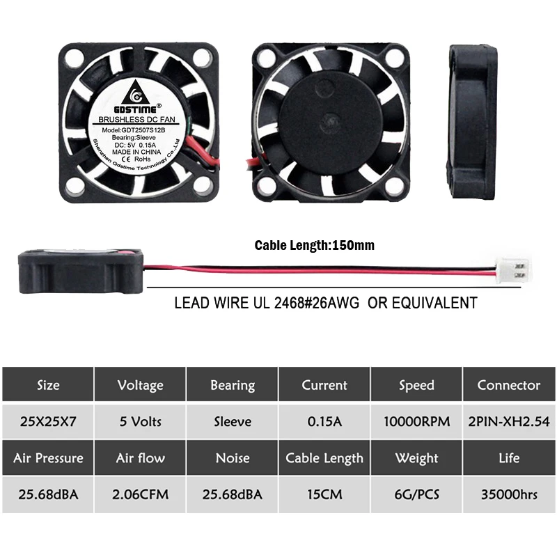 Comprar Gdstime-Mini ventilador de refrigeración para ordenador portátil, 25MM X 7MM, DC 5V, sin escobillas, 2507, 2 pines, XH2.54, 25X25X7MM, 2 unidades