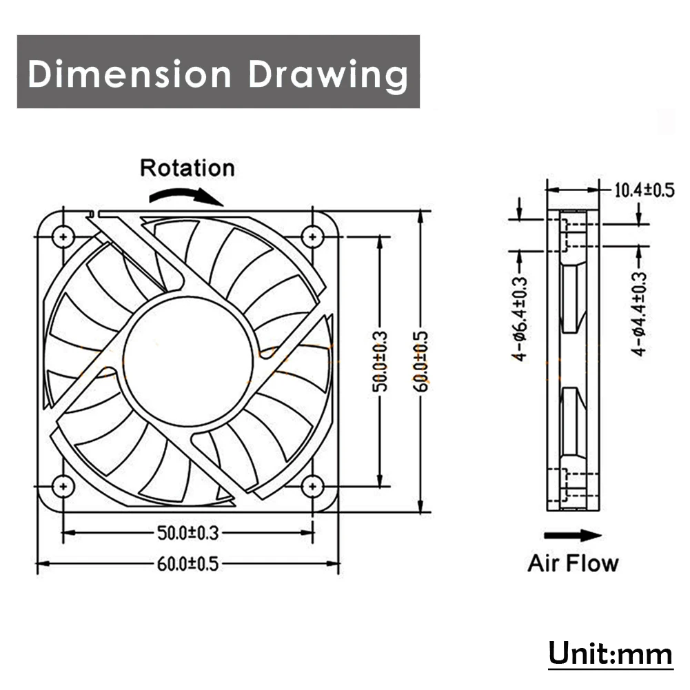 Características:100% nuevo y de alta calidadVentilador de refrigeración DC sin escobillasSe utiliza para mejorar la capacidad de ventilación del chasis y reducir la temperatura ambiente de trabajo del hardware del ordenador.Adecuado para equipos de comunicación eléctrica, purificadores, equipos médicos, lámparas LED, chasis, etc.Especificaciones:Dimensiones: 60x60x10mm/2,34 "x 2,34" x 0,39"Distancia de conexión: 50,0 ± 0,3mmTipo de rodamiento: manga/bolaConector: xh2.54-2pin/3Pin/USBTensión nominal: DC 5V/12V/24VCorriente nominal: como muestra la imagenVelocidad nominal: como muestra la imagenFlujo de aire: como muestra la imagenNivel de ruido: como muestra la imagenVida útil del ventilador: 35000hrs/50000hrsLongitud del Cable: aprox. 25cm/0,98 ''(longitud del conector incluida).Peso neto: 24 g/unidadAviso: