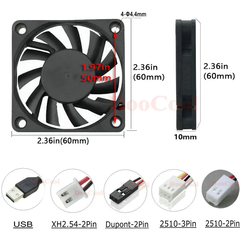 Características:100% nuevo y de alta calidadVentilador de refrigeración DC sin escobillasSe utiliza para mejorar la capacidad de ventilación del chasis y reducir la temperatura ambiente de trabajo del hardware del ordenador.Adecuado para equipos de comunicación eléctrica, purificadores, equipos médicos, lámparas LED, chasis, etc.Especificaciones:Dimensiones: 60x60x10mm/2,34 "x 2,34" x 0,39"Distancia de conexión: 50,0 ± 0,3mmTipo de rodamiento: manga/bolaConector: xh2.54-2pin/3Pin/USBTensión nominal: DC 5V/12V/24VCorriente nominal: como muestra la imagenVelocidad nominal: como muestra la imagenFlujo de aire: como muestra la imagenNivel de ruido: como muestra la imagenVida útil del ventilador: 35000hrs/50000hrsLongitud del Cable: aprox. 25cm/0,98 ''(longitud del conector incluida).Peso neto: 24 g/unidadAviso: