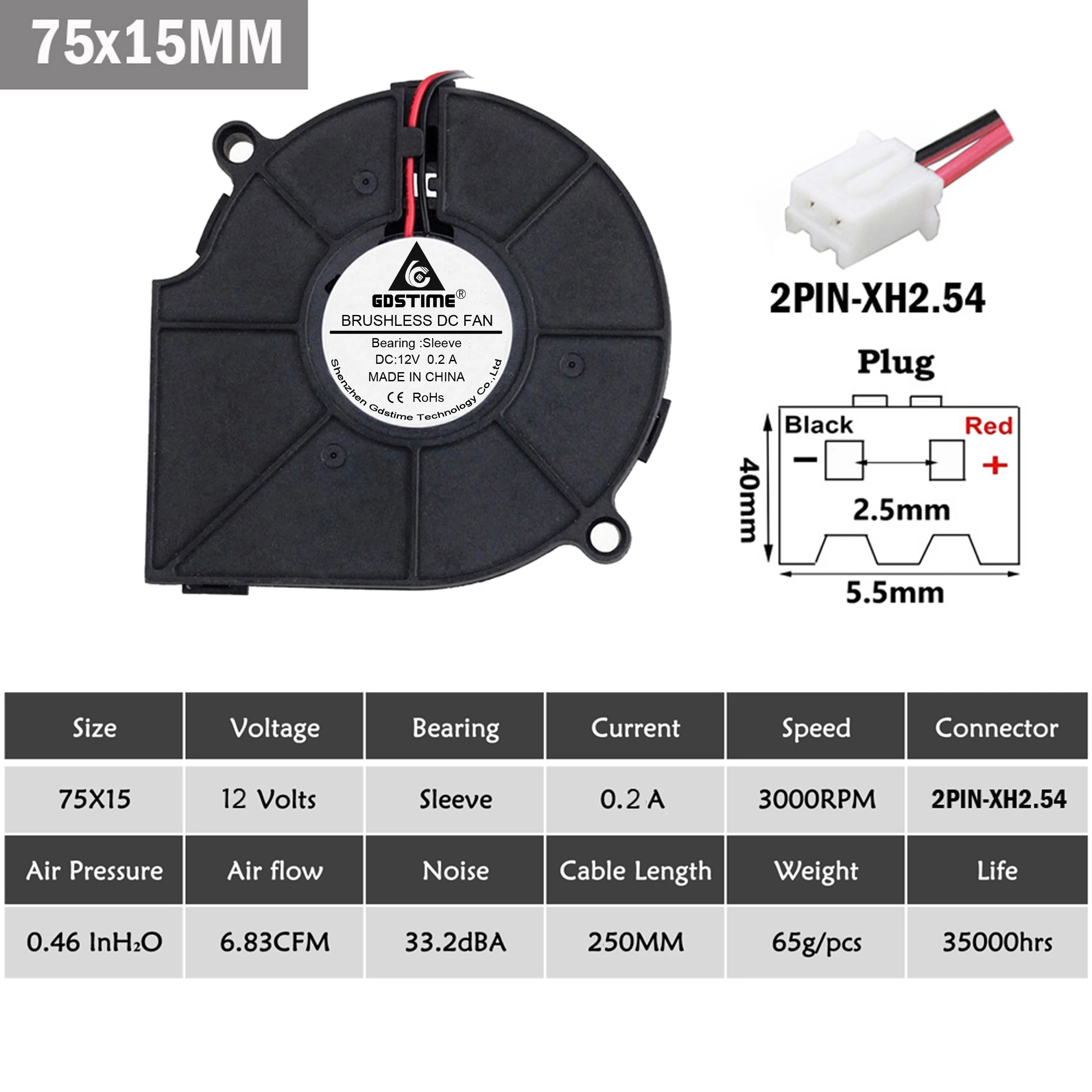 Comprar Gdstime-soplador de CC de 12V, 75mm, 7515, accesorios de refrigeración para impresora, Turbo, ventilador Radial, 75x15mm, 20 piezas