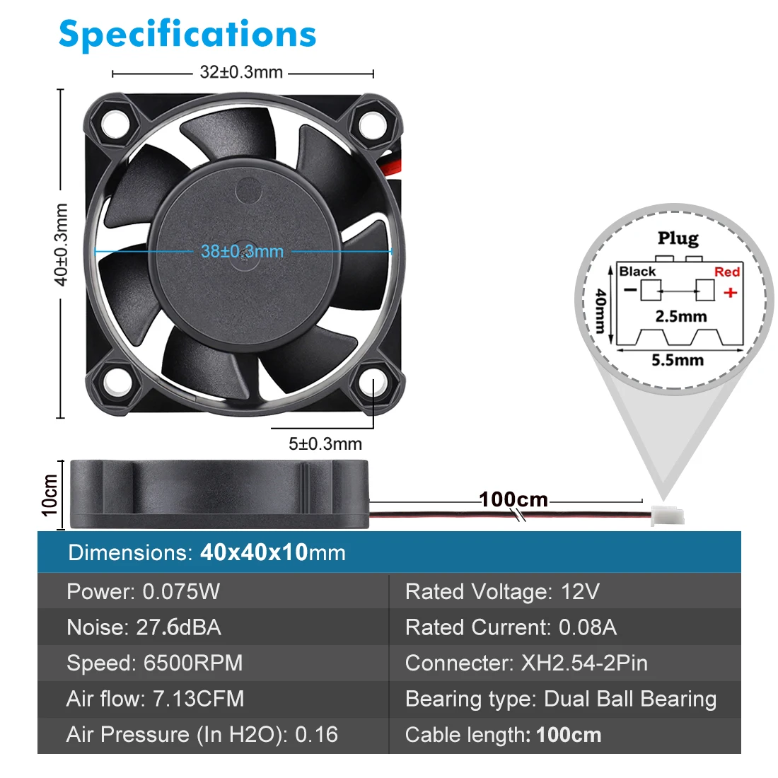 Ventilador de refrigeración CC sin escobillas 1M de largo 2 pines 12V 40mm x 40mm x 10 mm4010
