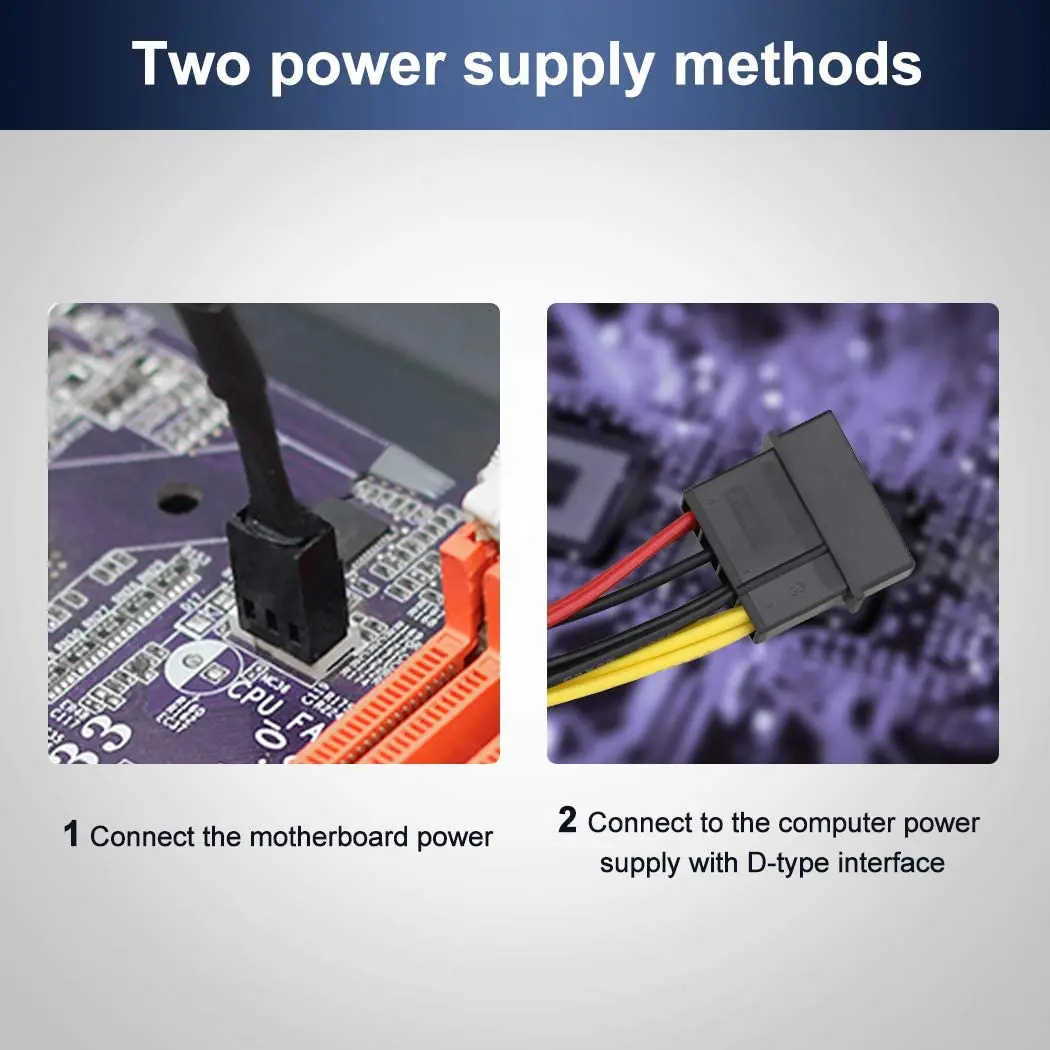 2 ventiladores combinados en una interfaz, se puede conectar a la interfaz de 3 o 4 pines de la placa base y solo necesita acceder a una interfaz para ejecutar todos los ventiladores. El Cable de interfaz tipo D incluye cuatro interfaces, tres voltajes: 5V 7V y 12V. Diferentes voltajes con diferente flujo de aire, velocidad y ruido. Puede seleccionar la interfaz de voltaje adecuada para iniciar el ventilador.