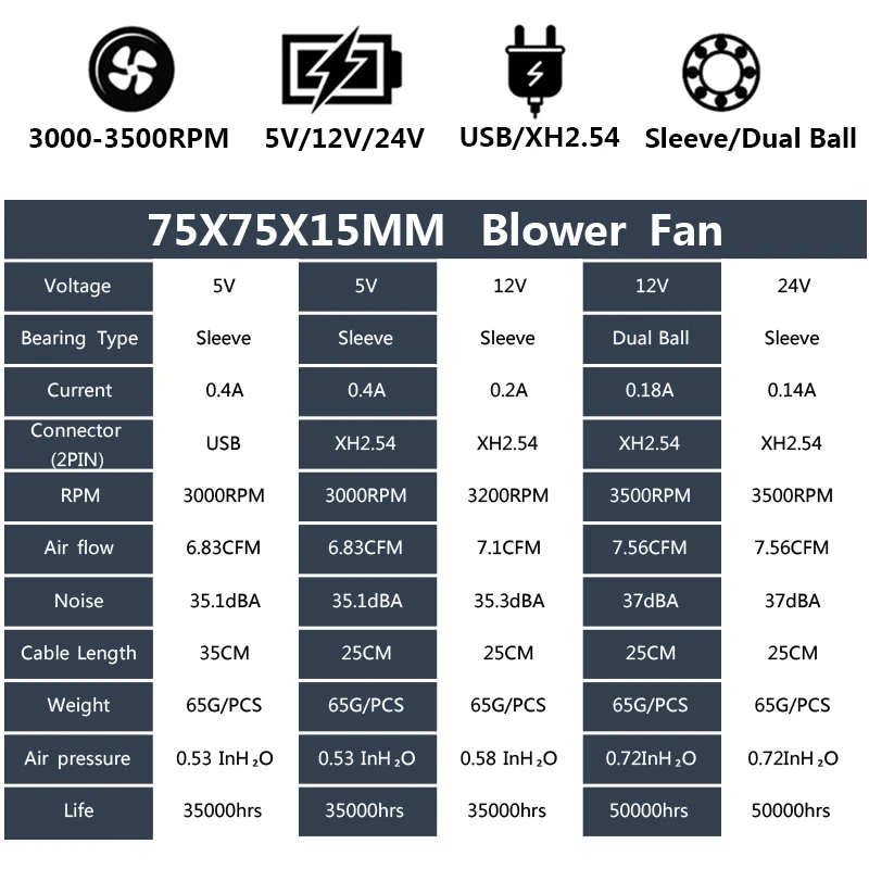 100% nuevo y de alta calidadPequeño 7530 DC 5V 12V 24V Mini ventilador centrífugoAmpliamente utilizado en impresoras 3D, purificadores de aire, humidificador, aromaterapia, ordenadores, servidores, oficina, comunicación, red, industrial, equipo médico, etc. Reemplazo ideal para reparación de refrigeración.