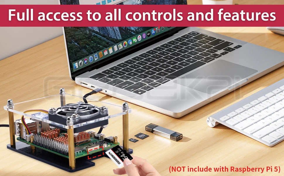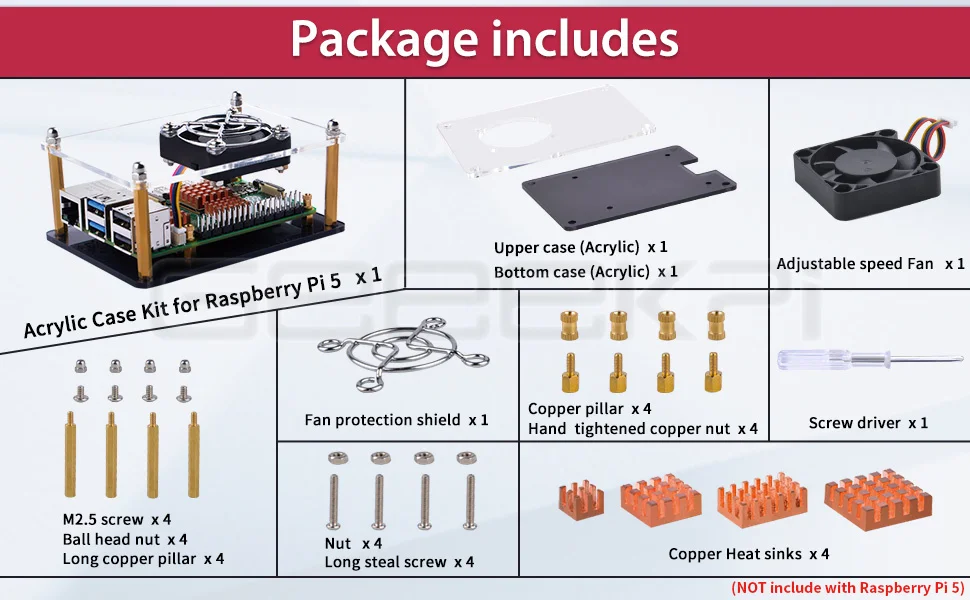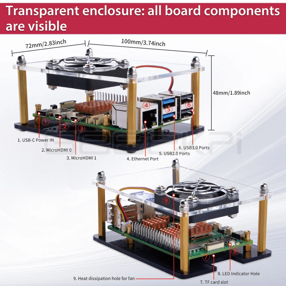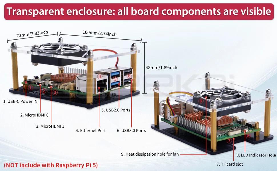 Funda Raspberry Pi 5 fácil de instalar:La instalación es fácil y simple con la ayuda del empalme acrílico. La caja acrílica proporciona una buena protección y es conveniente para instalar el ventilador para enfriar. El corte de precisión láser hace que se vea hermoso y generoso.