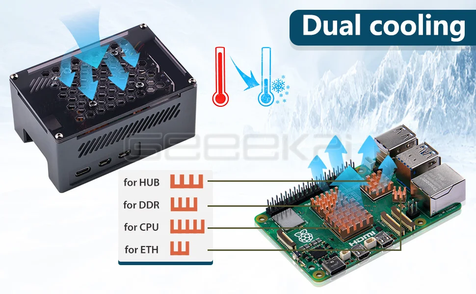 Está especialmente diseñado para Raspberry Pi 5.La carcasa está hecha de aluminio y acrílico que contiene un ventilador de refrigeración y un paquete de disipadores de calor de cobre puro. Proporcionará una protección muy eficaz para su Raspberry Pi 5.Es un estuche sencillo pero bonito con complementos completos.