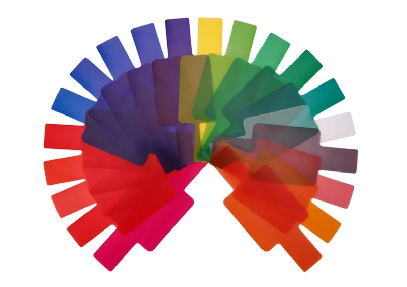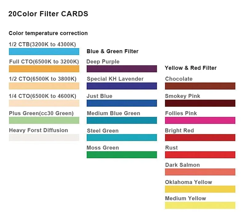 Cada kit incluye 14 geles de efectos de color, 5 geles de corrección de color y 1 gel de difusión.