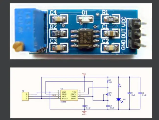 VCC: voltaje de entrada +SALIDA: salida de señalGND: potencia de entrada-Generador de impulsos NE555Introducción:1.Chip NE555 integrado2.Salida de señal única, salida de onda cuadrada con una relación de trabajo de aproximadamente 50%3.Resistencia ajustable integrada, ajuste la resistencia para controlar la frecuencia de salida.4.Indicador de alimentación a bordo5.Voltaje de funcionamiento: 5 ~ 12V6. Tamaño del tablero: 29 (mm) x12 (mm)
