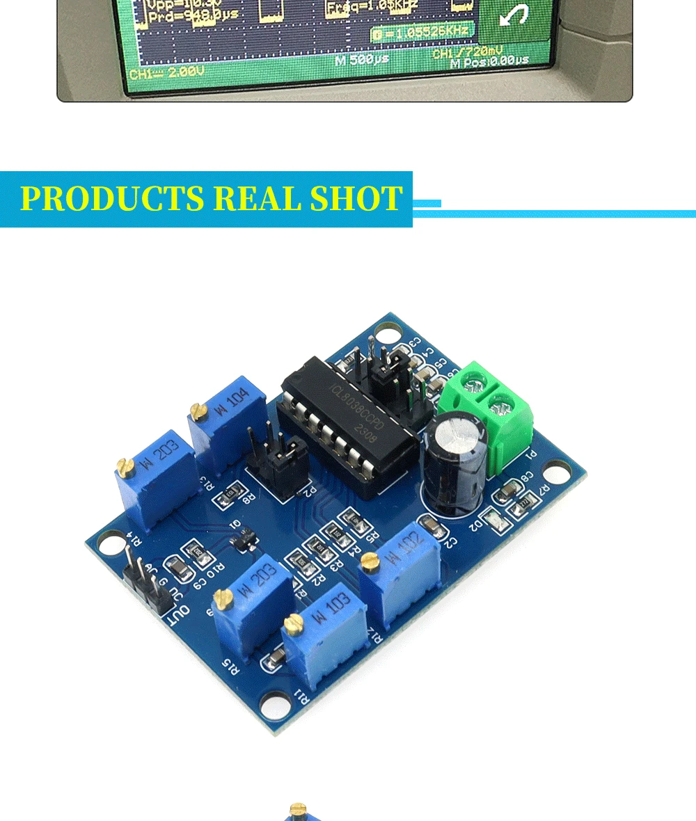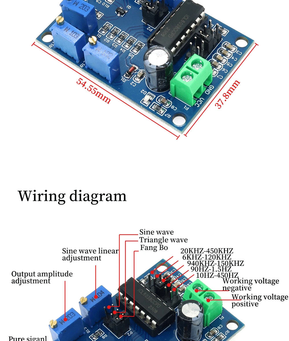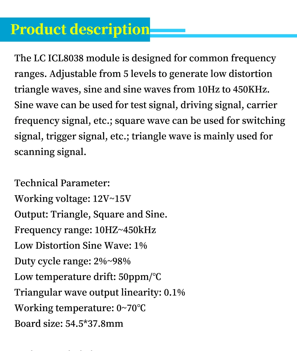 El módulo LC ICL8038 está diseñado para rangos de frecuencia comunes.Ajustable desde 5 niveles para generar ondas triangulares de baja distorsión, ondas sinusoidales y sinusoidales de 10 Hz a 450 KHz.La onda sinusoidal se puede utilizar para señales de prueba, señales de conducción, señales de frecuencia portadora, etc.; La onda cuadrada se puede utilizar para cambiar señal, activar señal, etc.; La onda triangular se utiliza principalmente para escanear señales.