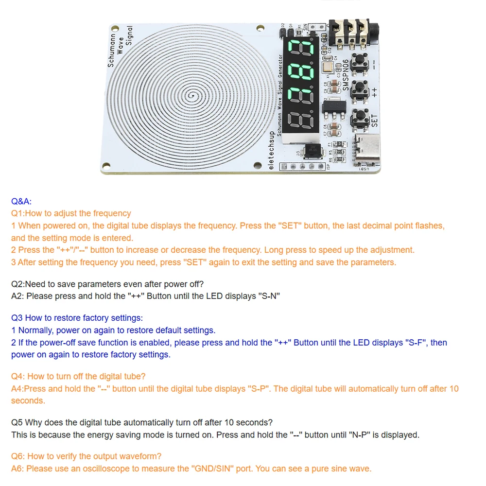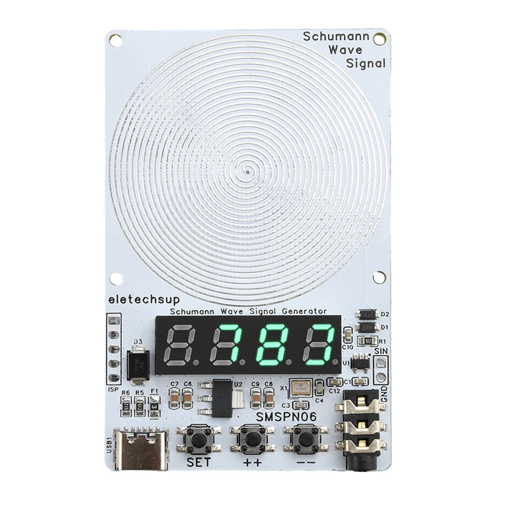 Uso: Conéctese a una fuente de alimentación tipo C.La pantalla digital mostrará 7,83 y la placa emitirá automáticamente una onda Schumann de 7,83 Hz.