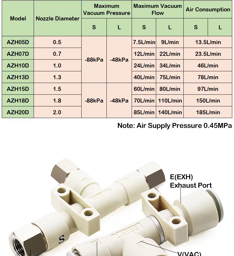 El tipo de alto flujo es diferente del tipo de alto vacío en el diseño de boquilla, lo que sacrifica la presión negativa máxima y aumenta el flujo de succión. Aunque la presión negativa máxima que se puede lograr es inferior a la del tipo de alto vacío, el flujo máximo de succión también es mayor. Con el aumento del flujo de succión, la intersección del rendimiento de presión negativa disminuye más lentamente, lo que es más adecuado para ocasiones con una pequeña cantidad de fugas.