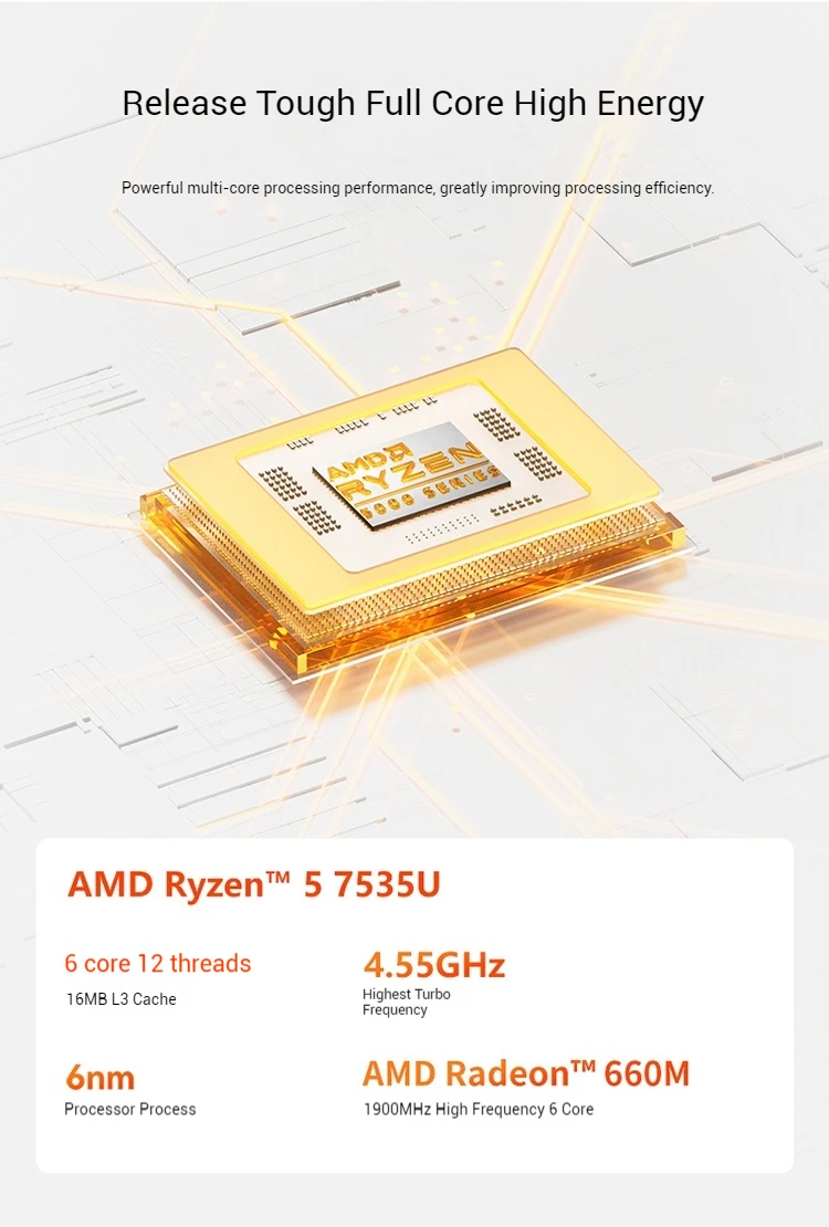 AMD Ryzen ™ 5 7535U, 6 núcleos 12 hilos, 2,9 GHz, TDP: 35-54 W
